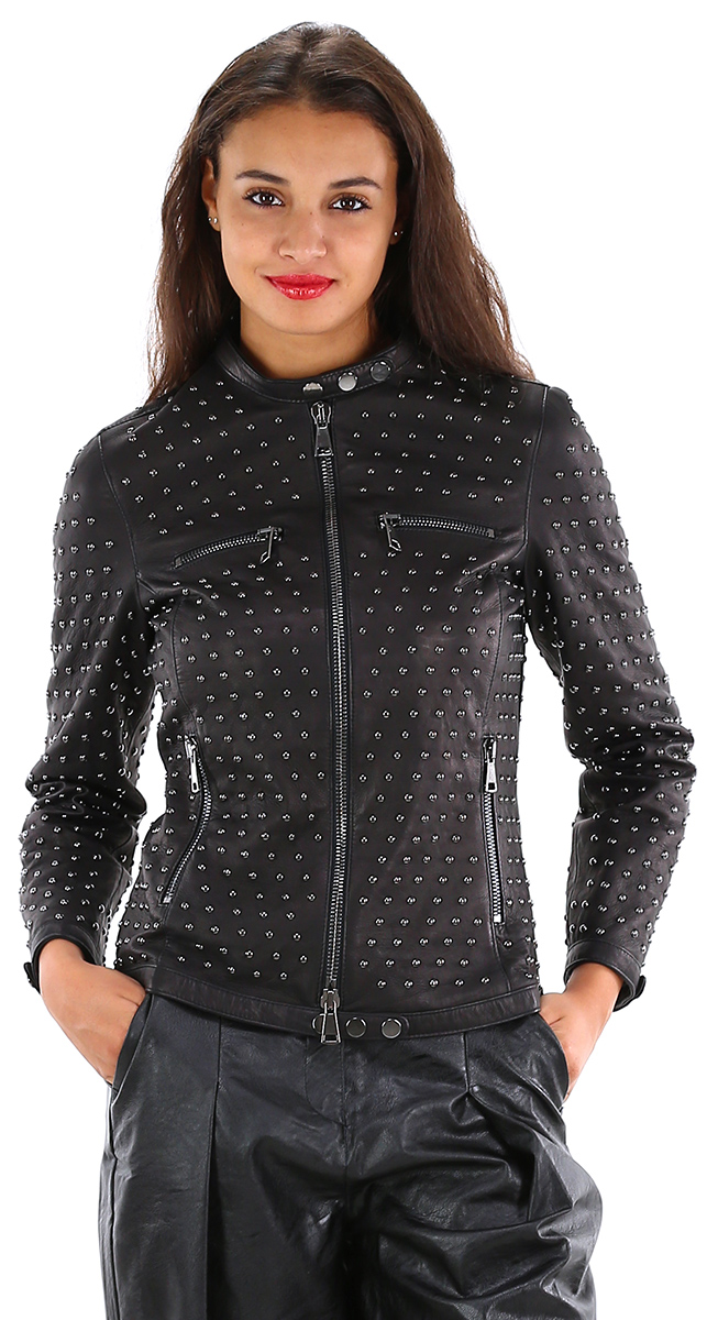 Giubbino con borchie foderato in vera pelle. Tasche con zip e di chiusura frontali, maniche lunghe e collo a giro. La modella è alta 1.80 ed indossa la taglia 40.