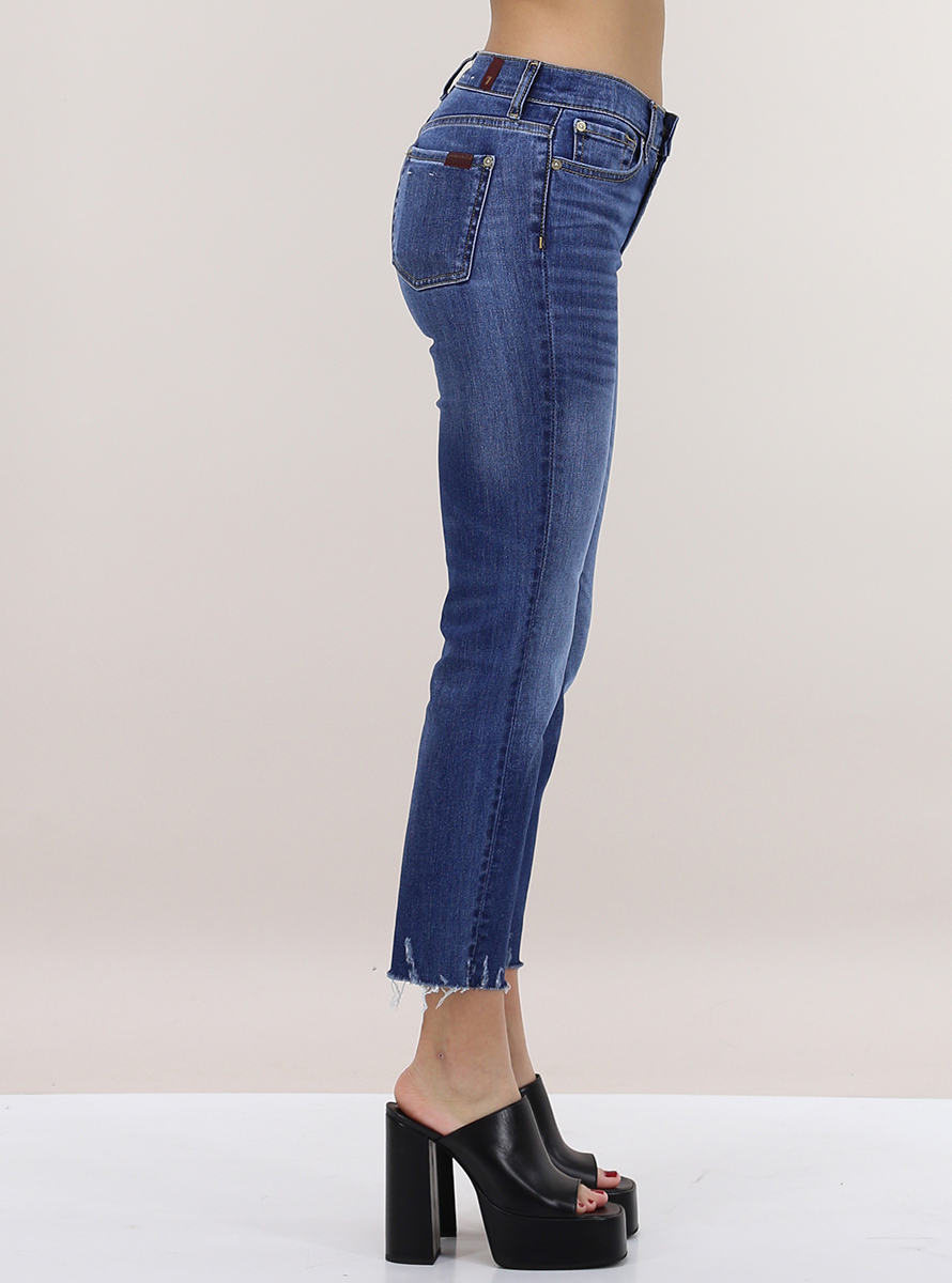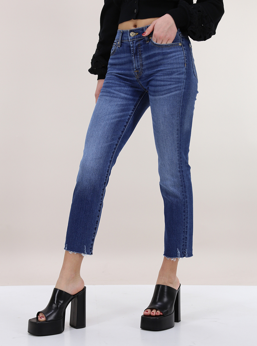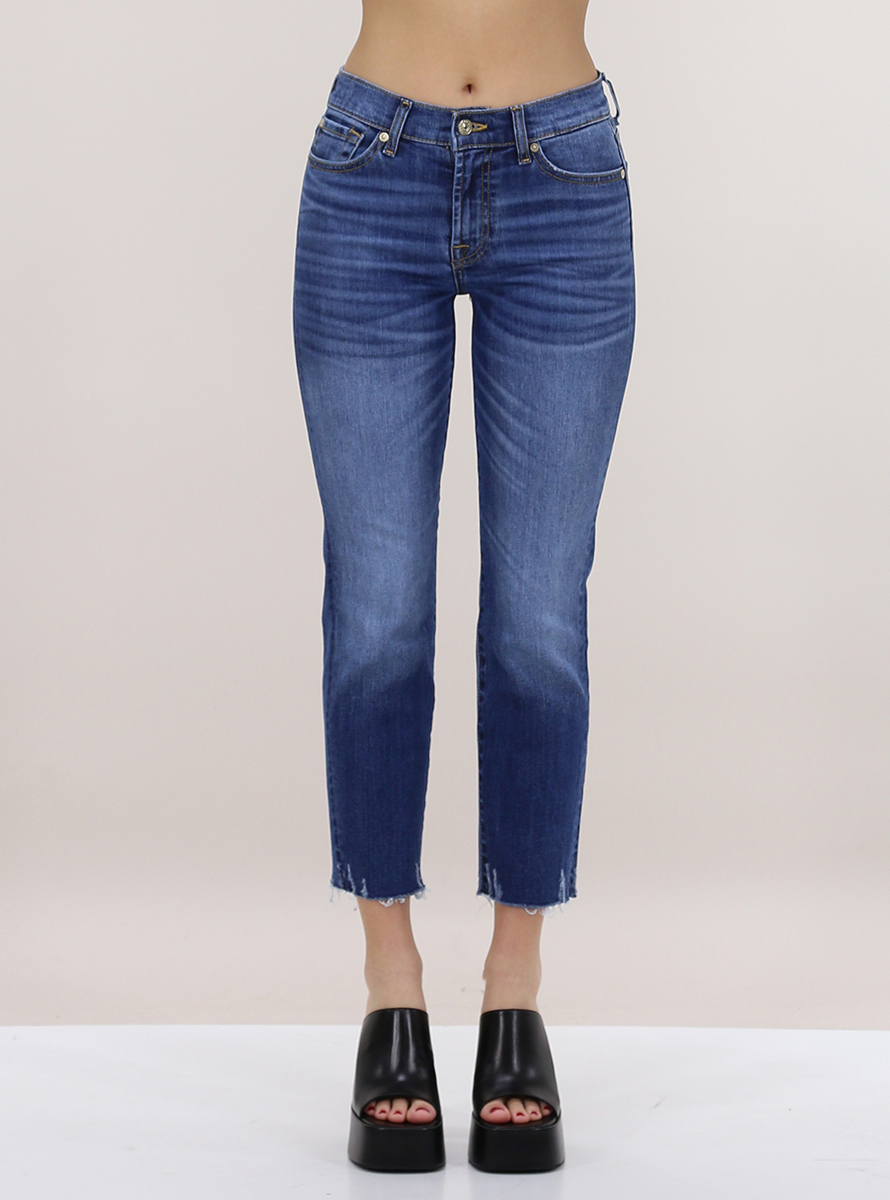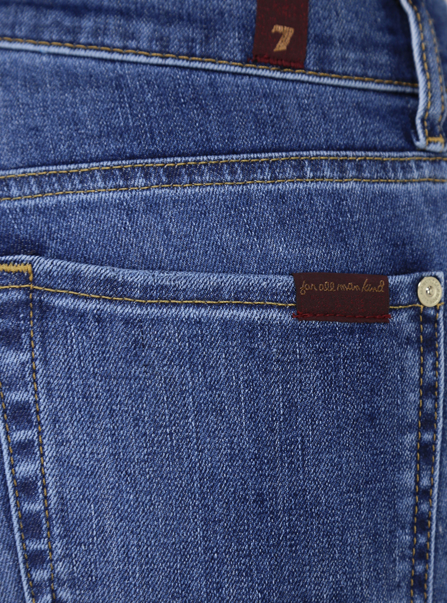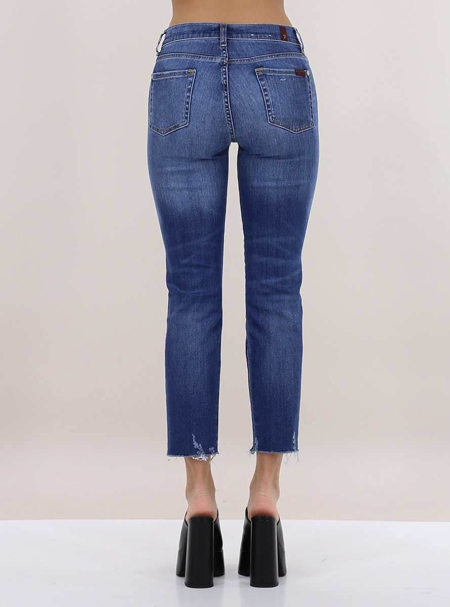 Jeans 7 For All Mankind in denim di cotone stretch. Vestibilità slim e vita regolare. Fondo taglio vivo. La modella è alta 1.75 ed indossa la taglia 26.