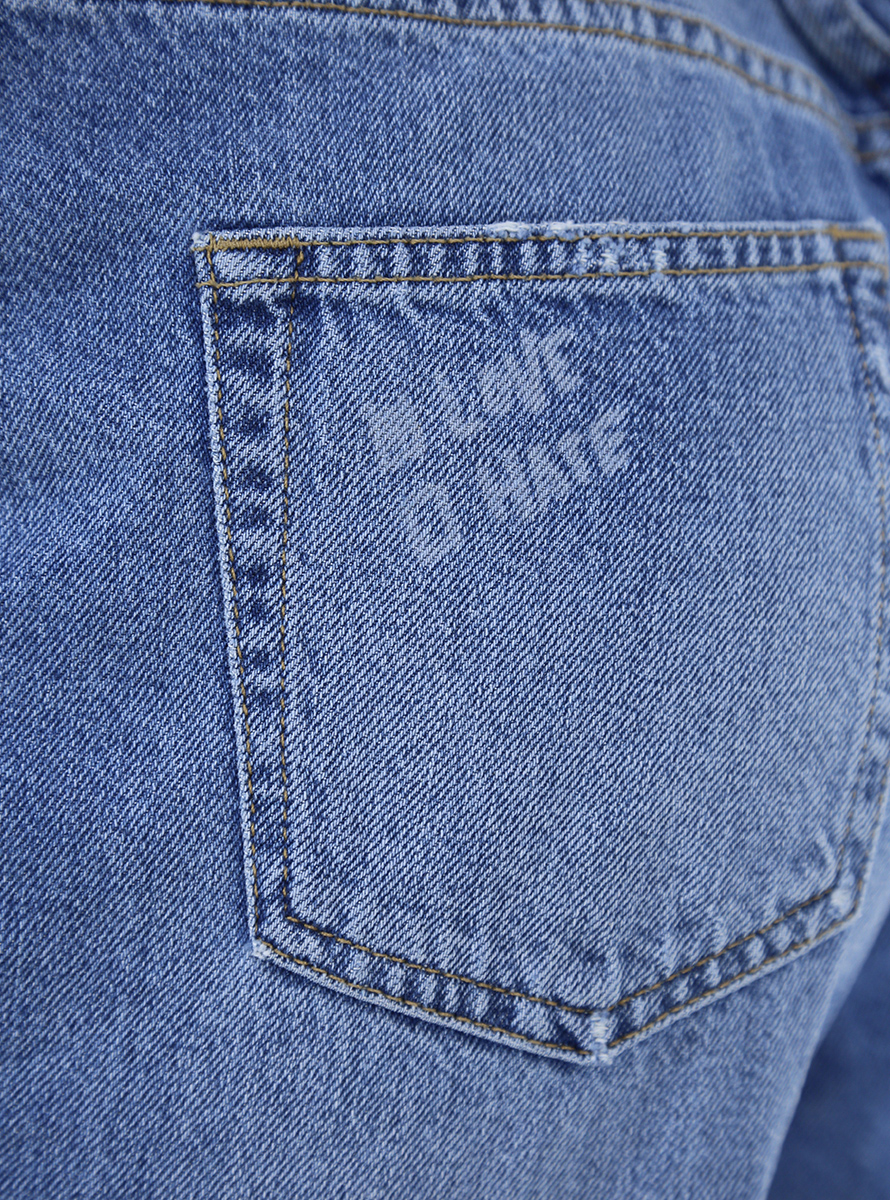 Jeans morbidi Blugirl in denim di cotone a vita alta. Strappi e scritte logate. La modella è alta 1.70 ed indossa la taglia 26.