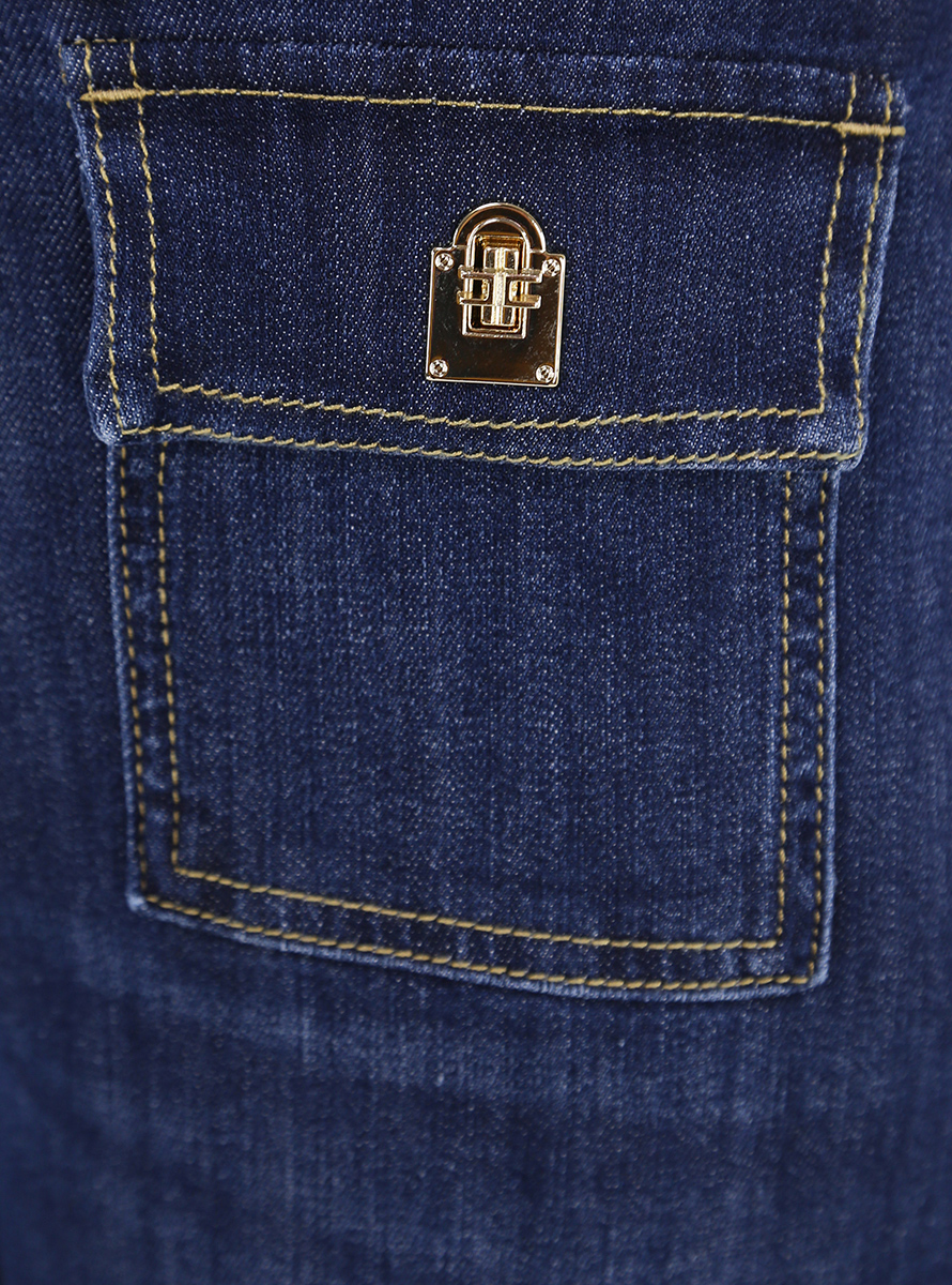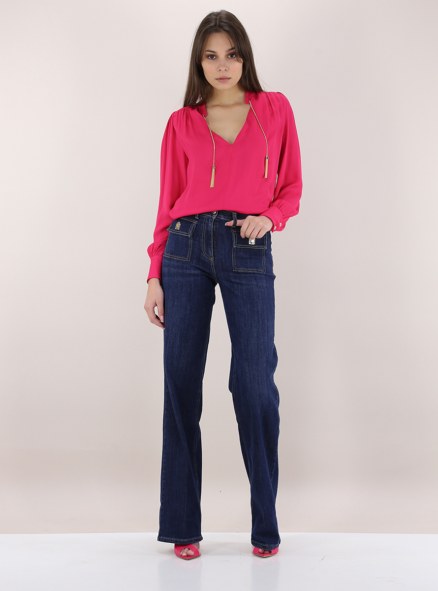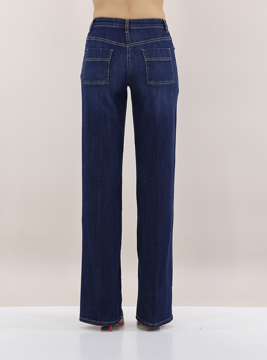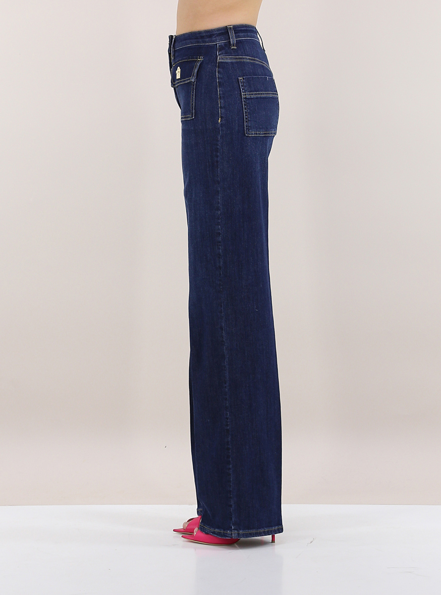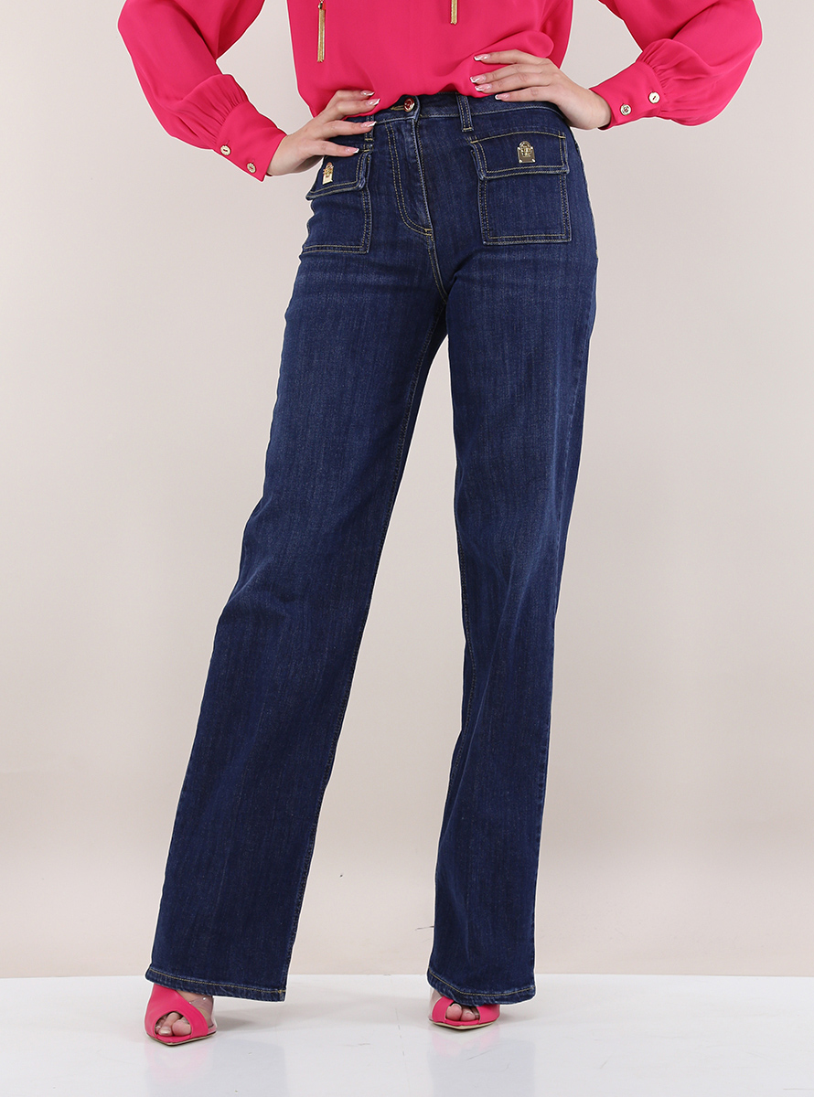 Jeans a palazzo Elisabetta Franchi in denim di cotone stretch. Vita alta con tasche a toppa fronte e retro. Dettagli logati gold. La modella è alta 1,68 ed indossa la taglia 26.