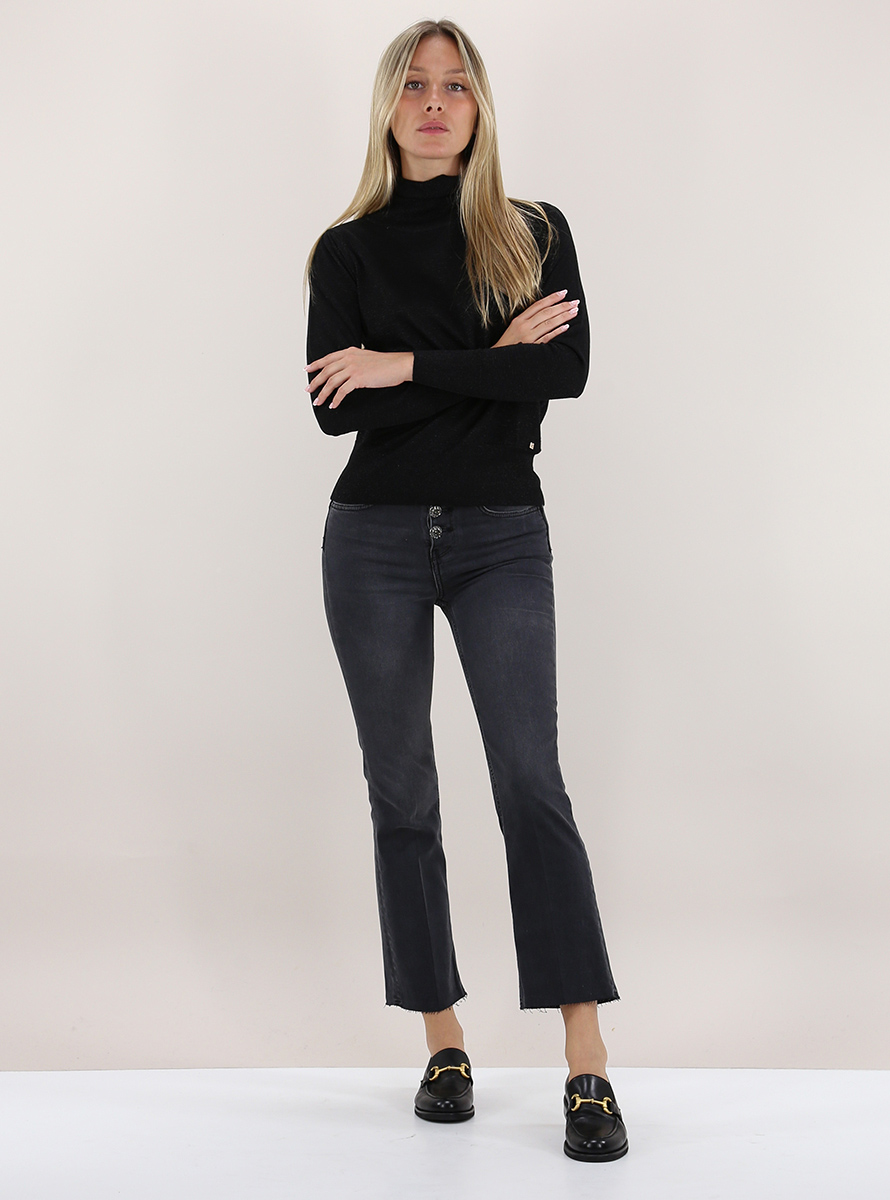Jeans Liu.Jo in denim di cotone stretch ad effetto bottom up. Vita alta con bottoni di chiusura gioiello frontali. Fondo a taglio vivo. La modella è alta 1.70 ed indossa la taglia 26.