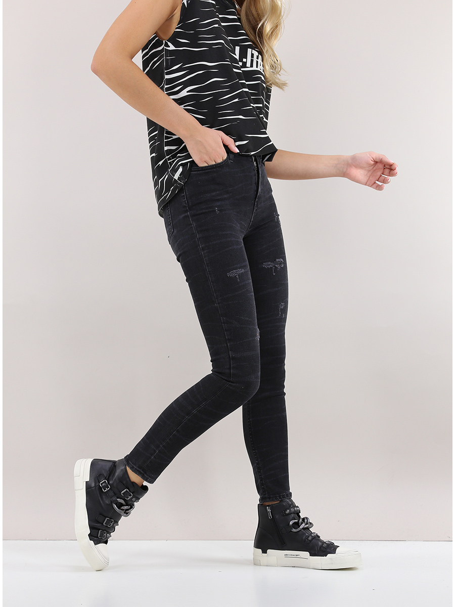 Jeans Nolita in denim di cotone stretch. Vita alta e vestibilità skinny. Abrasioni fronte e retro. La modella è alta 1,70 cm ed indossa la taglia 25.