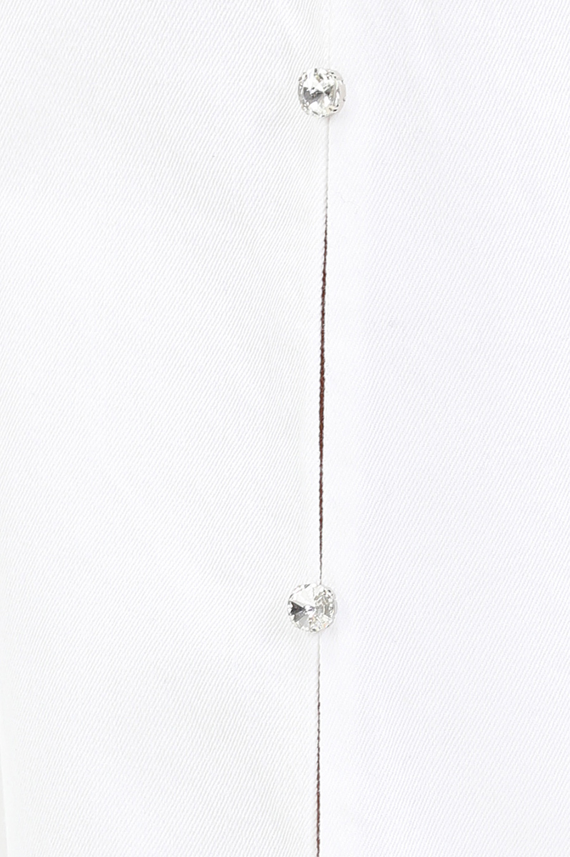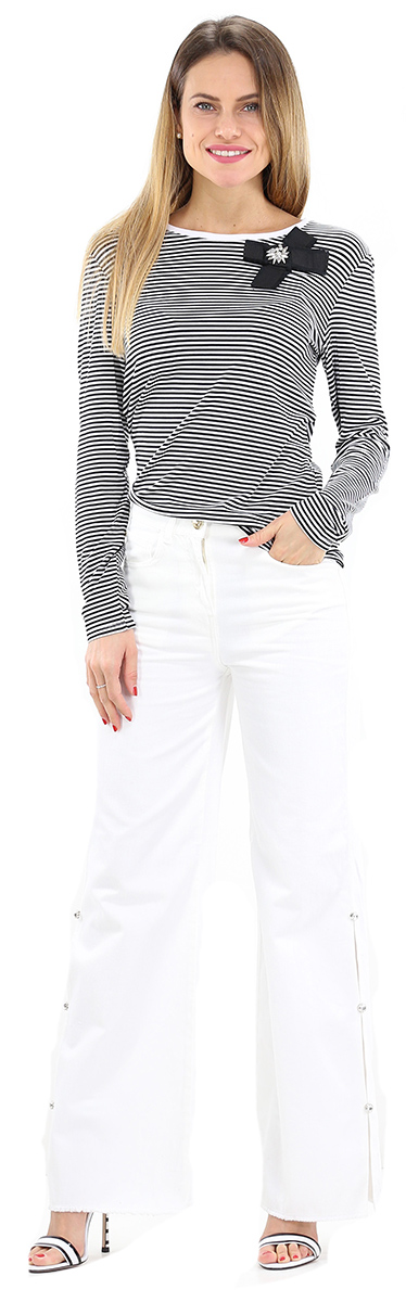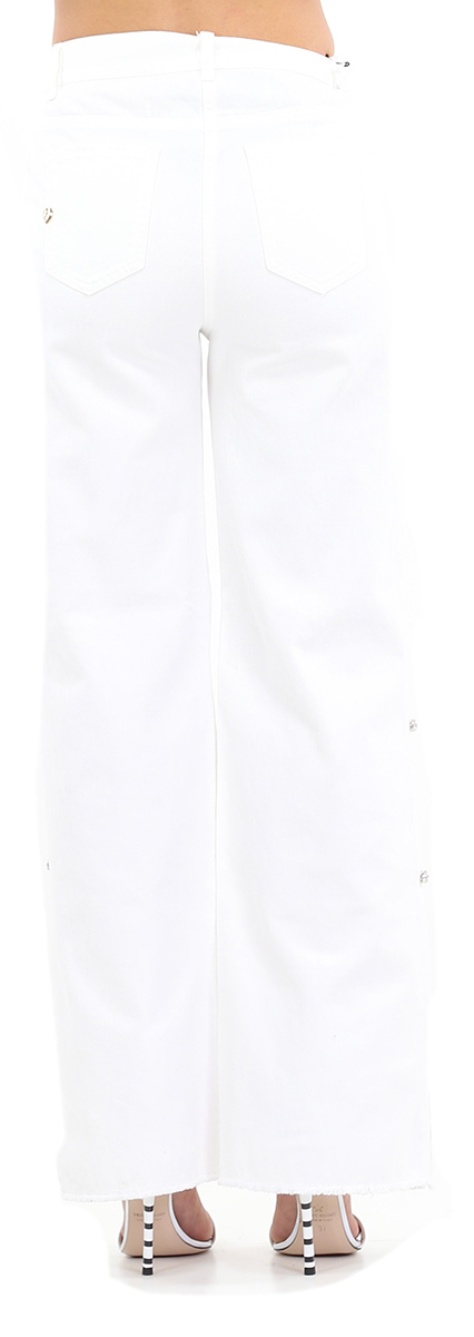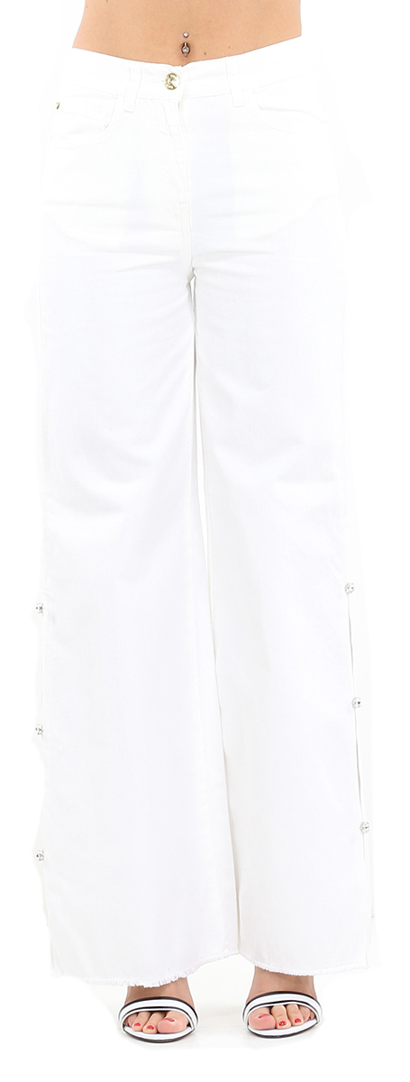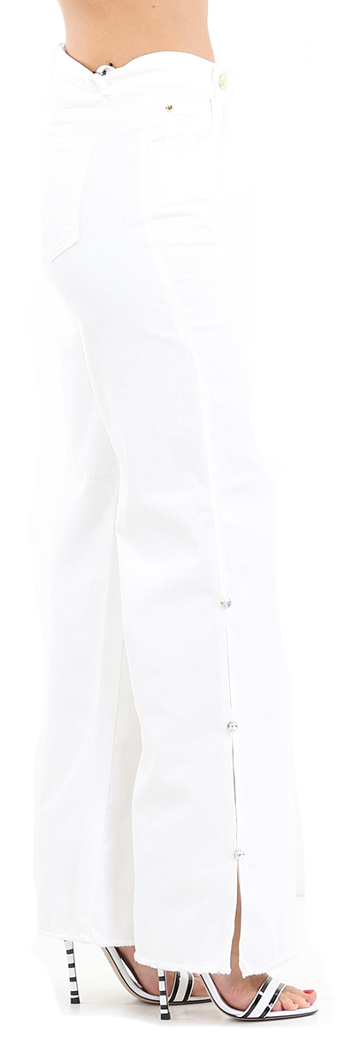 Jeans palazzo in cotone a cinque tasche e bottoni gioiello laterali applicati. La modella è alta 1.68 ed indossa la taglia 25.