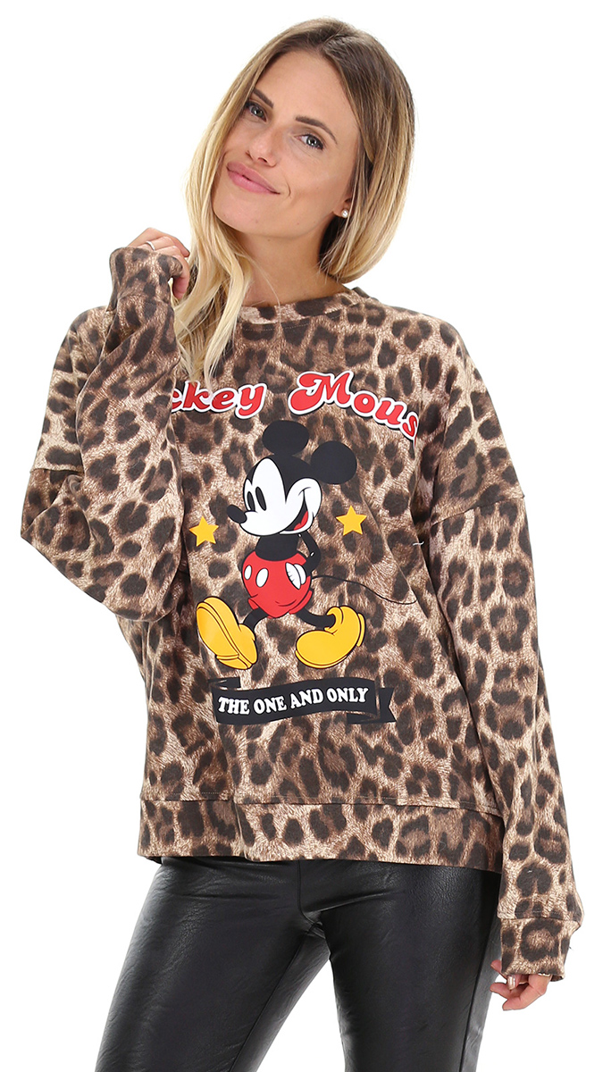 Felpa in cotone a maniche lunghe e collo a giro. Fantasia animalier con stampa Mickey Mouse. La modella è alta 1.68 ed indossa la taglia XS.