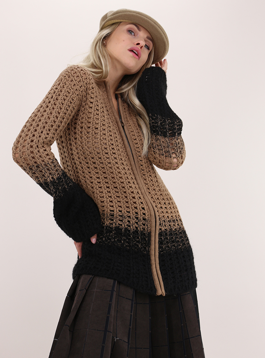 Cardigan Aviu' in misto lana e mohair a maniche lunghe e collo a giro. Zip di chiusura frontale e lavorazione a rete degradé. La modella è alta 1,67 e indossa la taglia 40.