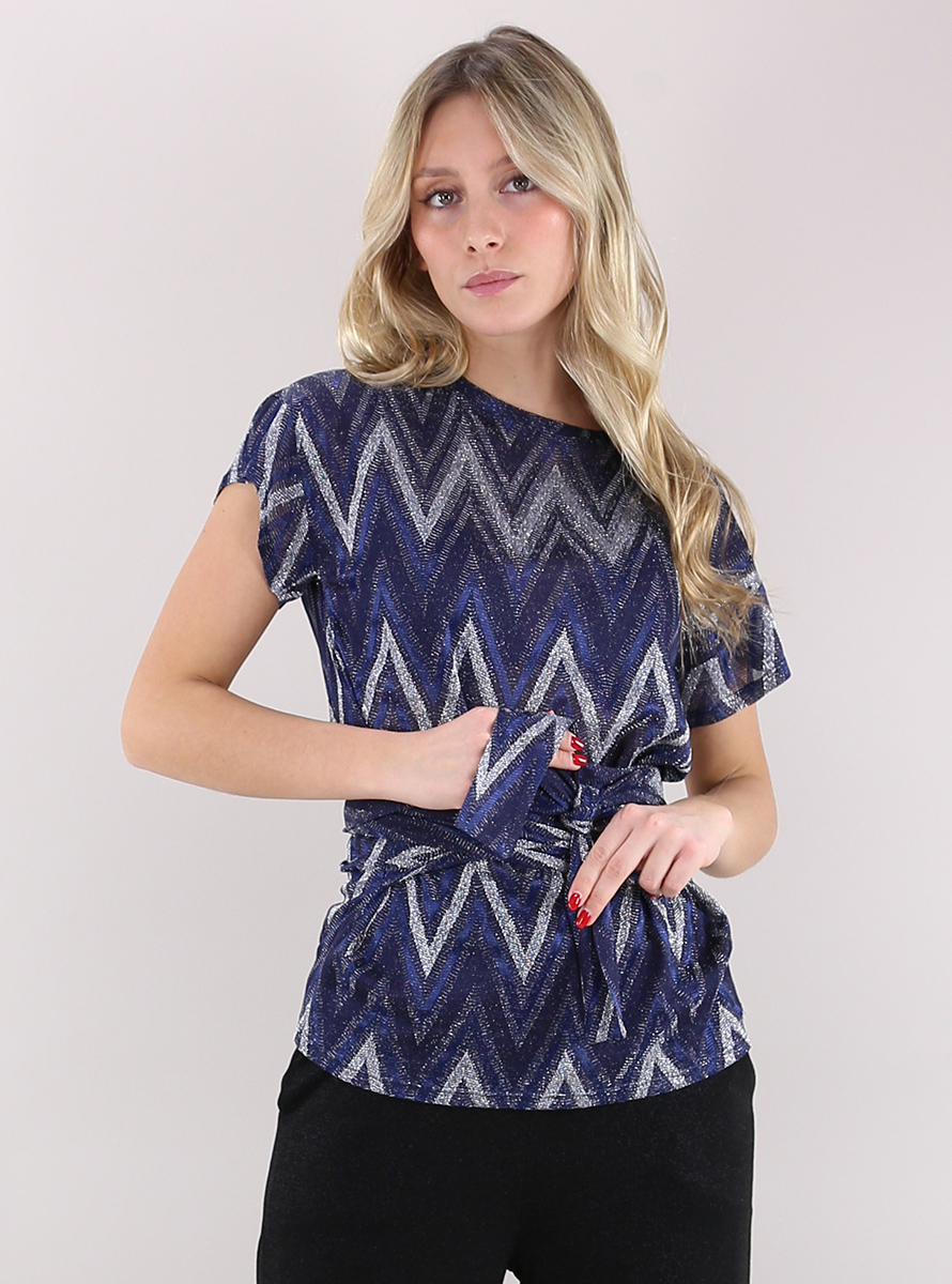 Maglia Kocca in misto viscosa a maniche corte e collo a giro. Cintura in tessuto applicata in vita. Fantasia a zig zag multicolor con lurex. La modella è alta 1.70 ed indossa la taglia XS.