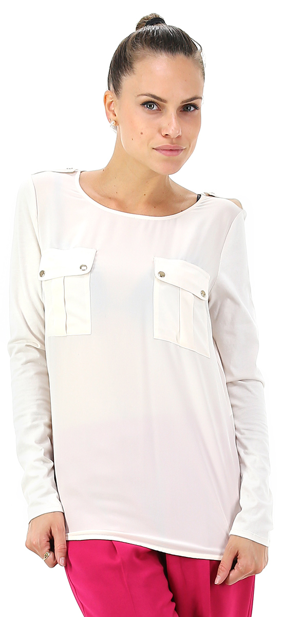 Maglia effetto camicia a manica lunga e girocollo. Parte frontale in 100% seta con doppia tasca, maniche e retro in cotone. La modella è alta 1.68 ed indossa la taglia XS.