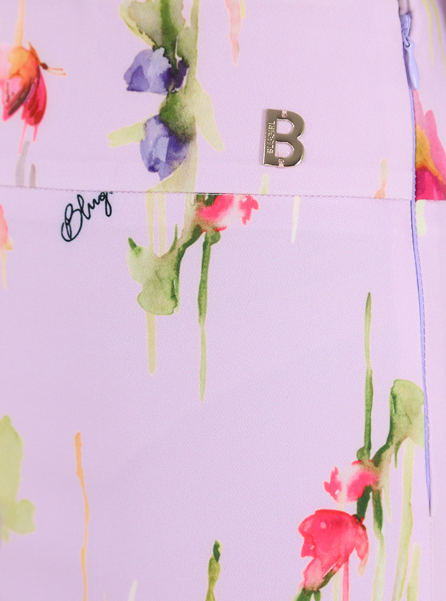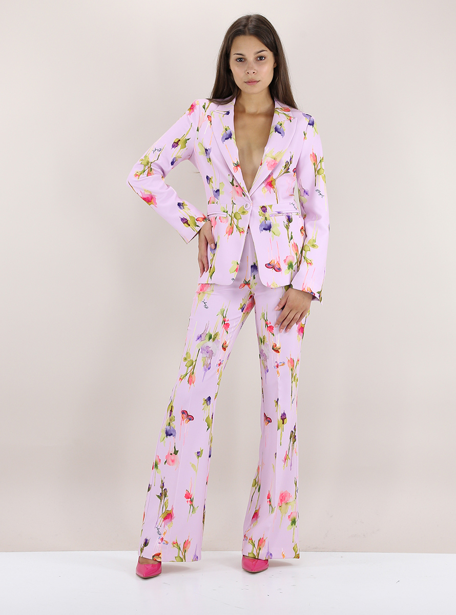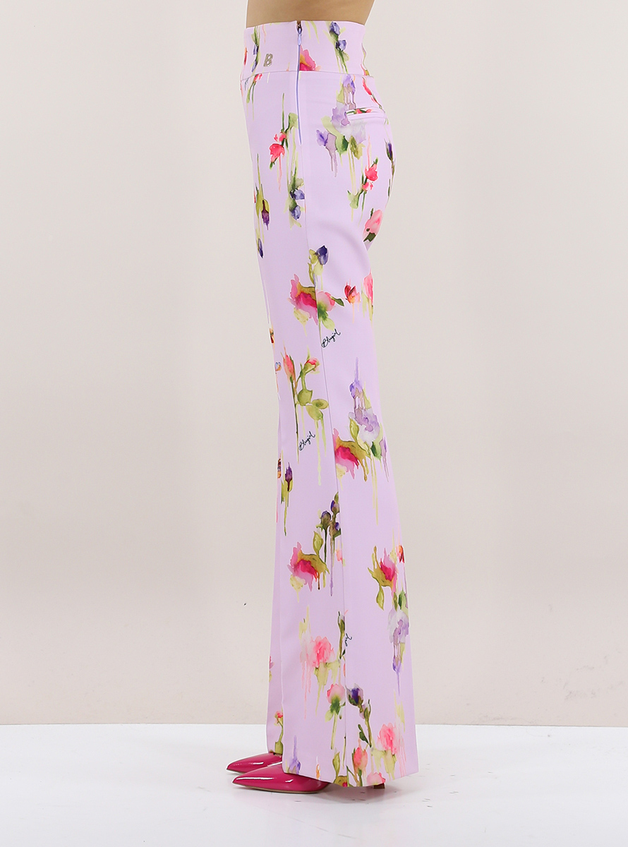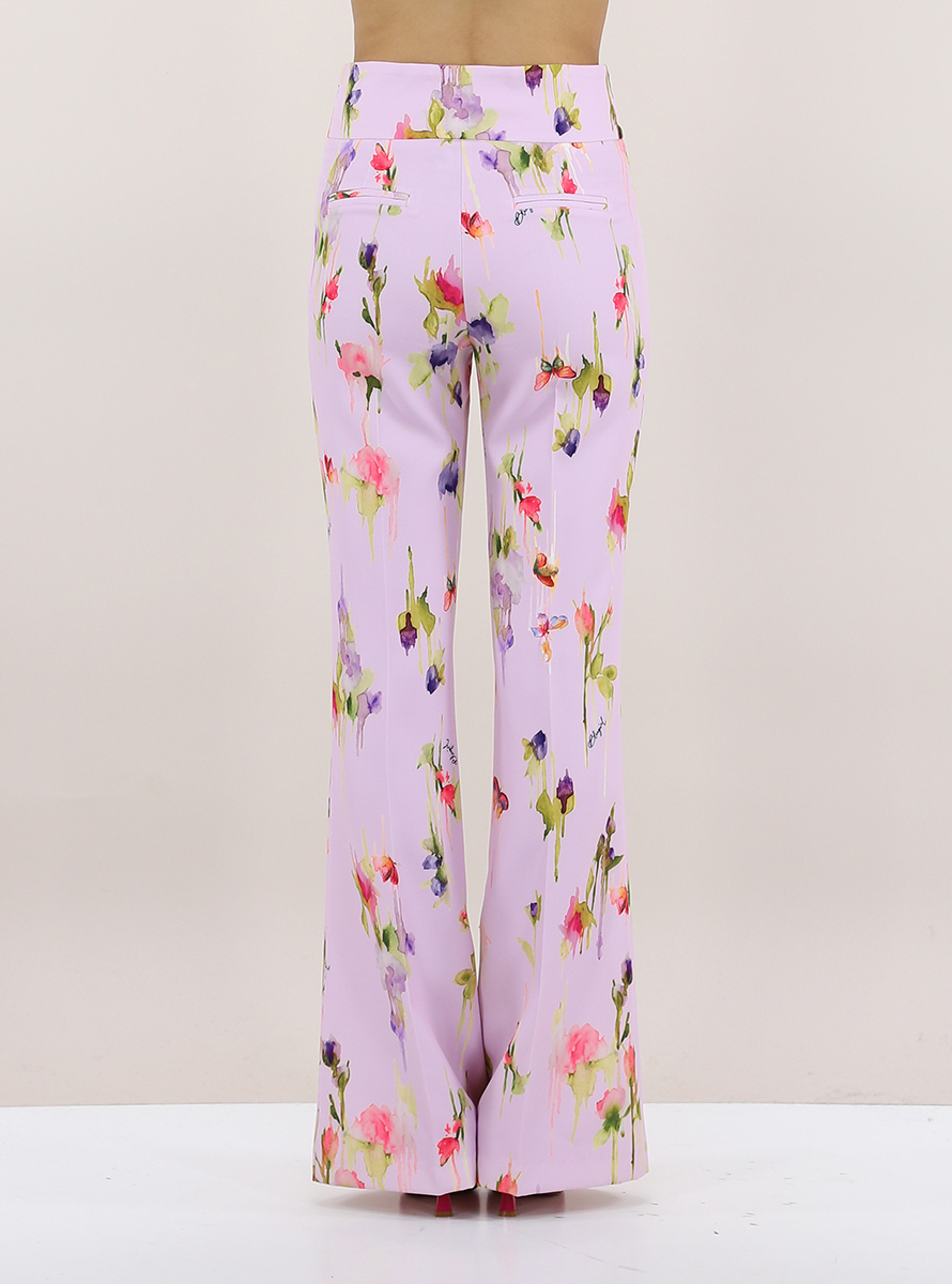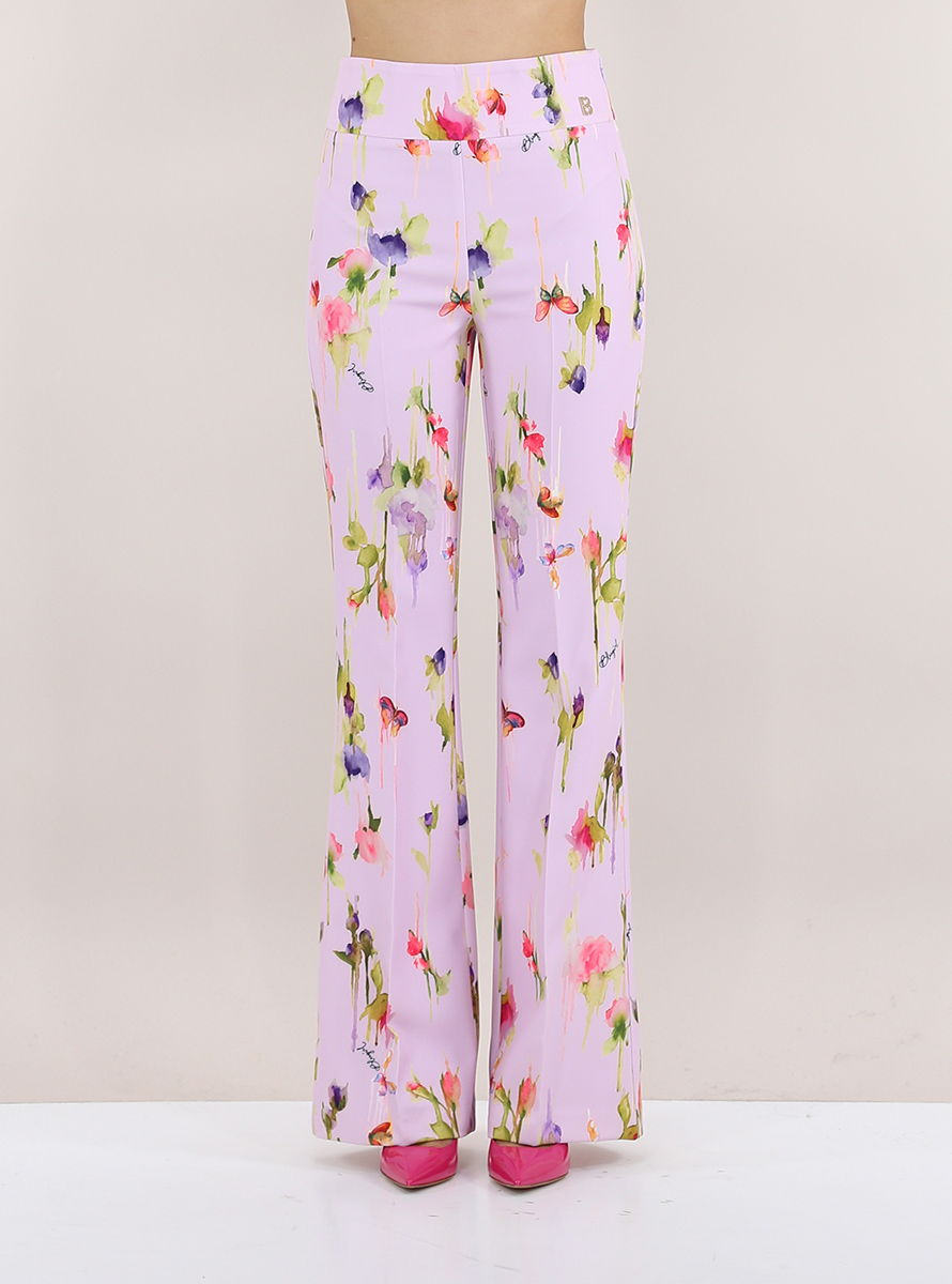 Pantalone a zampa Blugirl a vita alta. Tasche a filetto sul retro e zip di chiusura laterale. Fantasia floreale multicolor. La modella è alta 1,75 e indossa la taglia 40.