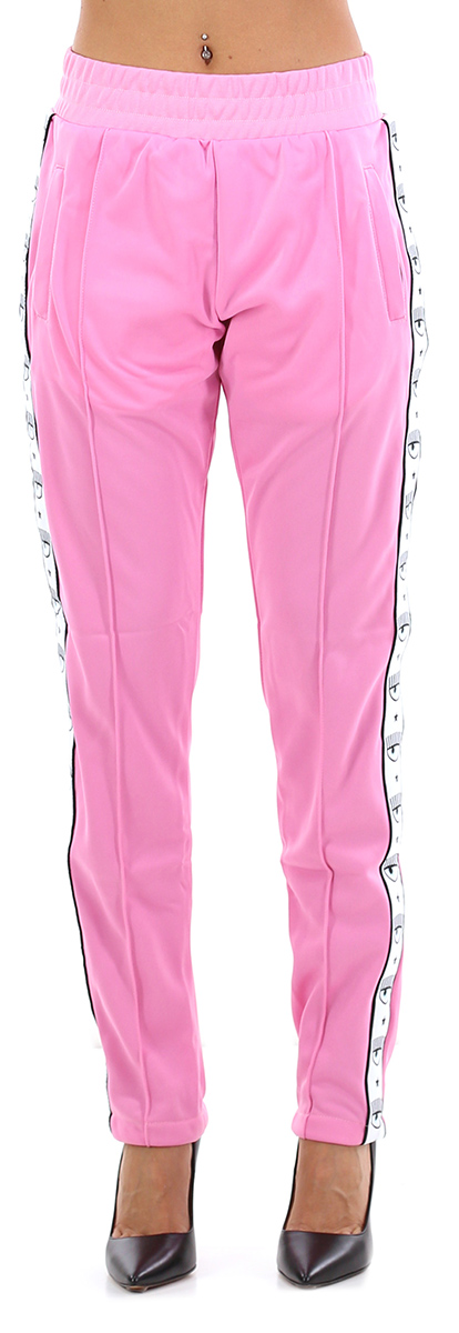 Pantalone tuta con bande laterali logate. Tasche a sacchetto ed elastico in vita. La modella è alta 1.68 ed indossa la taglia XS.