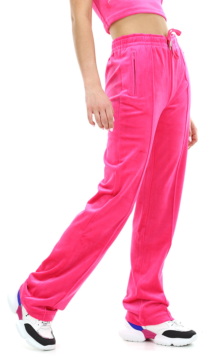 Pantalone palazzo Juicy Couture in ciniglia stretch. Vita alta con elastico e coulisse. Tasche a sacchetto con zip. Logo in strass applicato sul retro. La modella è alta 1,68 ed indossa la taglia S.