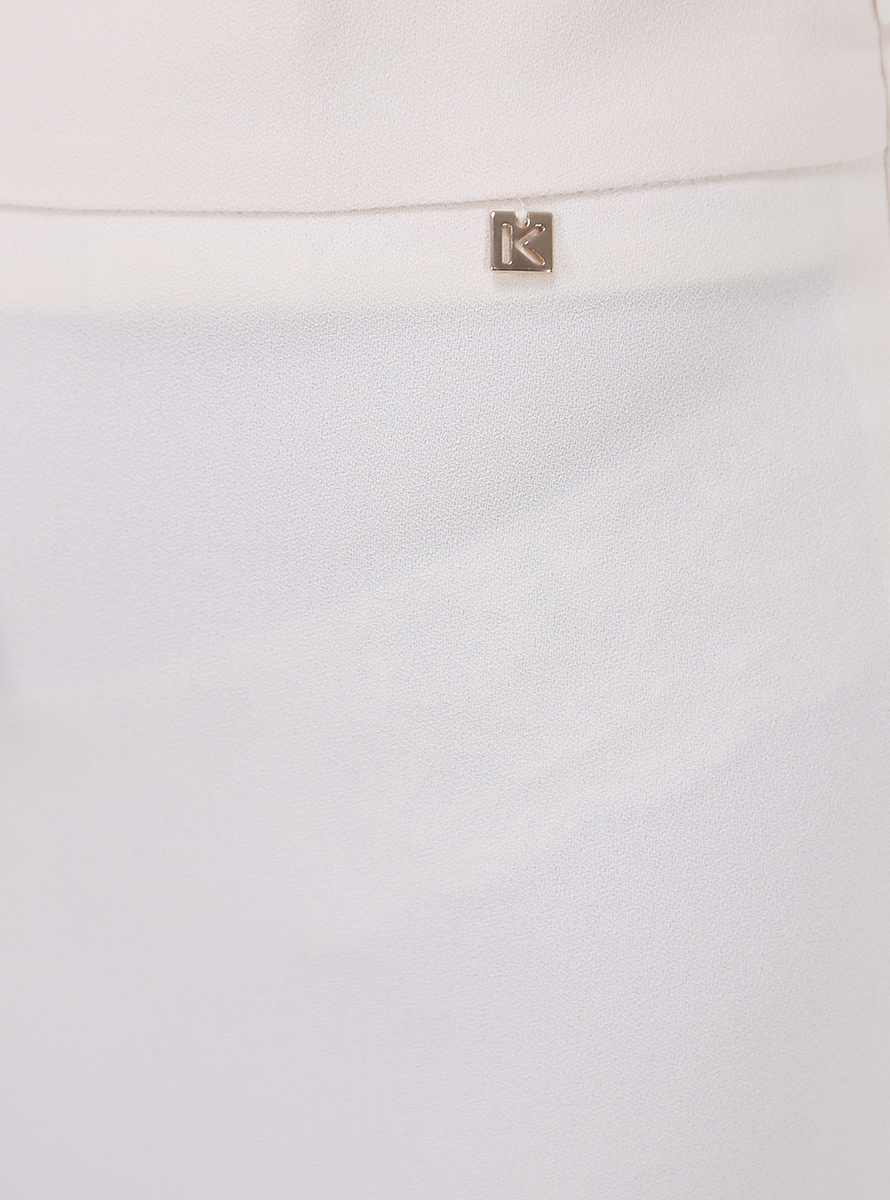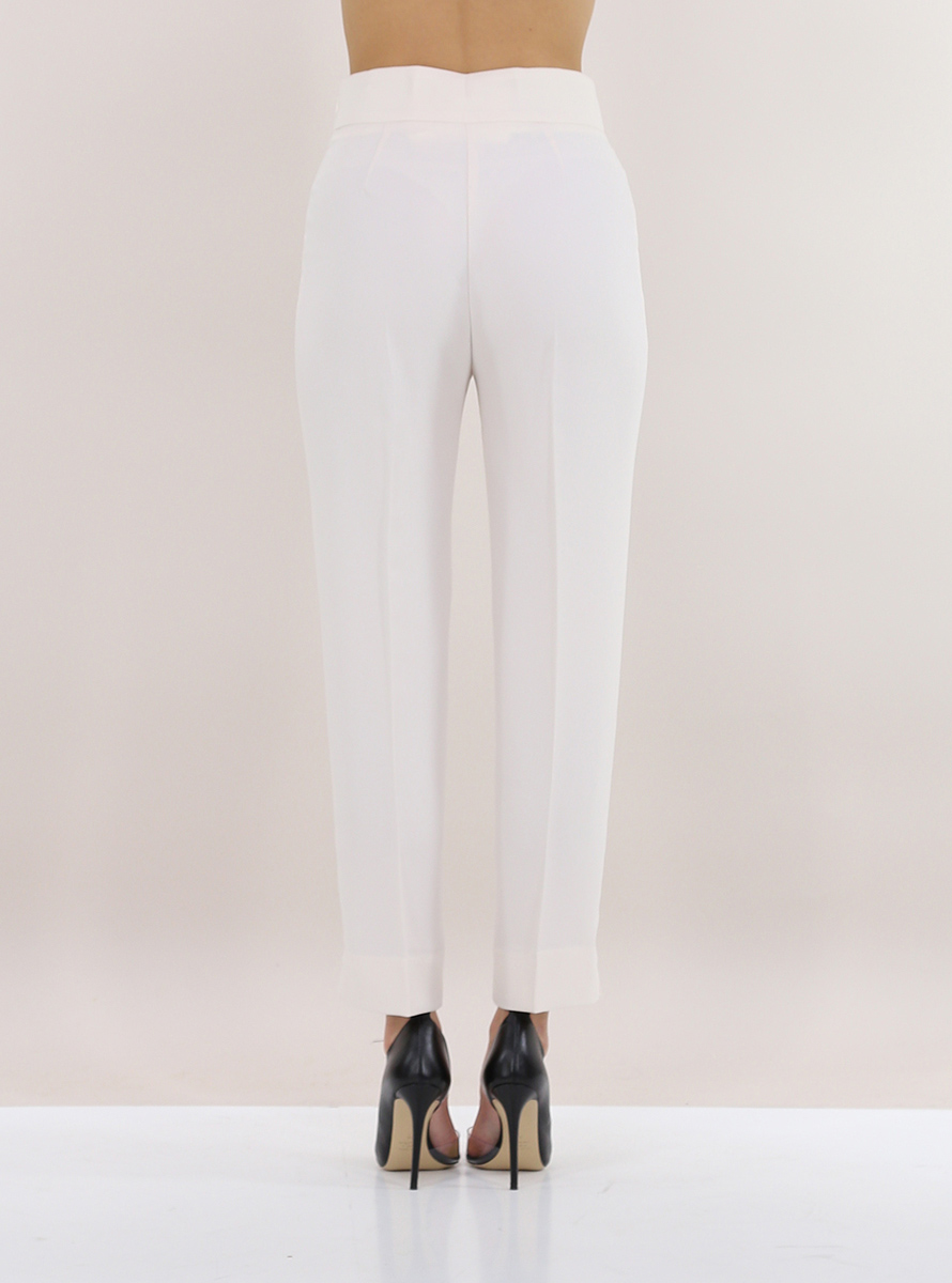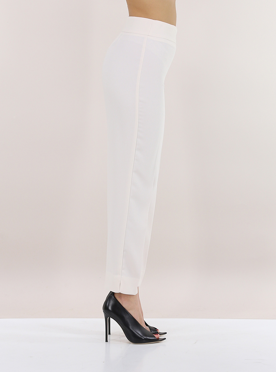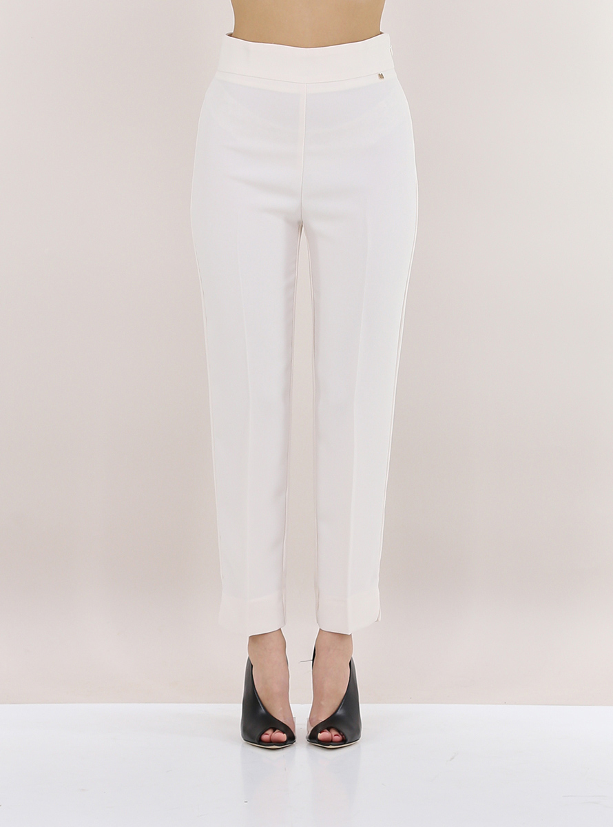 Pantalone Kocca a vita alta con zip di chiusura laterale. Spacchi sul fondo. La modella è alta 1,75 e indossa la taglia 40.