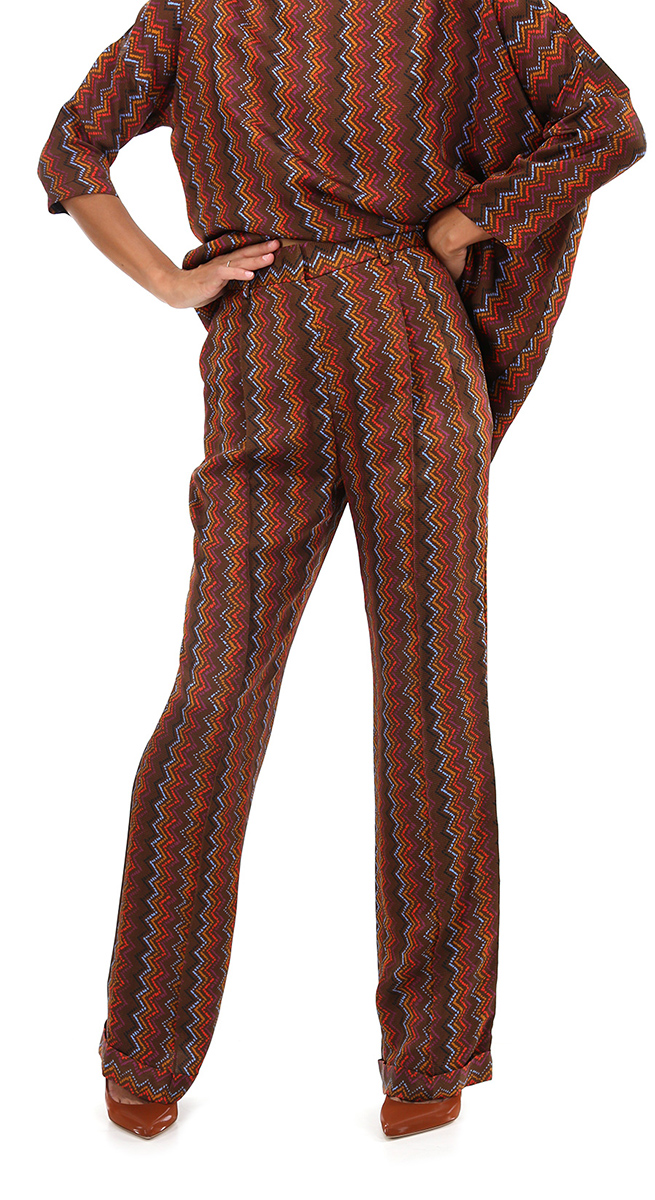 Pantalone a palazzo in viscosa con tasche all'americana e a filetot su retro. Pinces frontali e risvolto sul fondo. Fantasia a zig zag multicolor. La modella è alta 1,71 cm ed indossa la taglia 40.