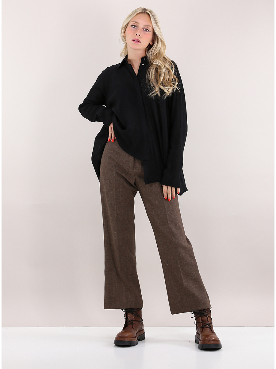 Pantalone Malloni a trombetta in lana con fodera. Taschini frontali e alamari sul retro. Vita alta. Trama melange. La modella è alta 1.70 ed indossa la taglia 42.