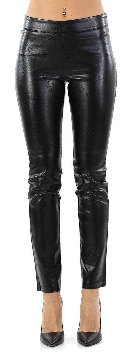 Pantaloni in ecopelle con zip di chiusura sul fianco. La modella è alta 1,68 ed indossa la taglia 38.