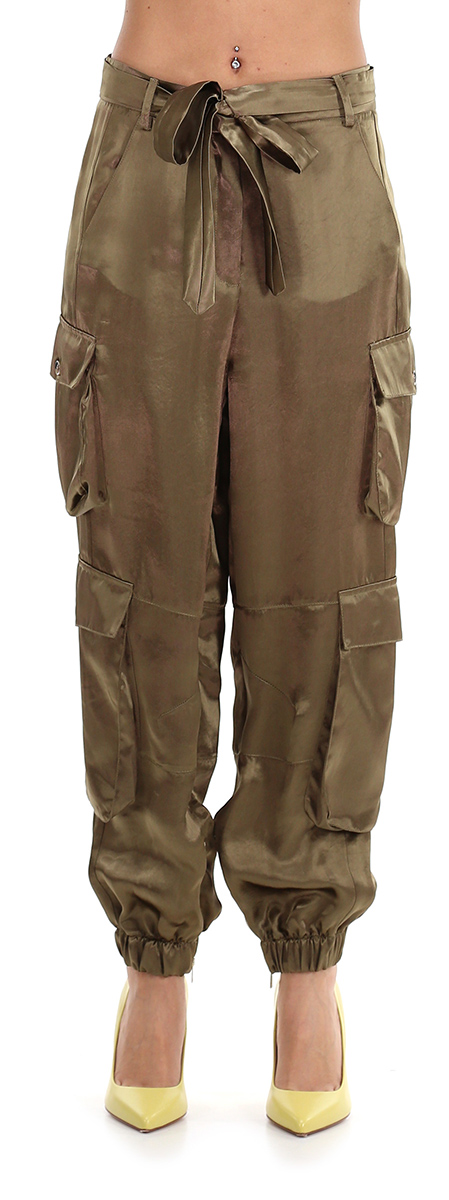 Pantalone cargo a vita alta in raso di misto viscosa. Cintura in tessuto inclusa. La modella è alta 1.68 ed indossa la taglia 40.