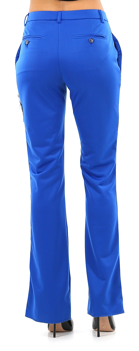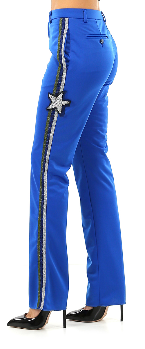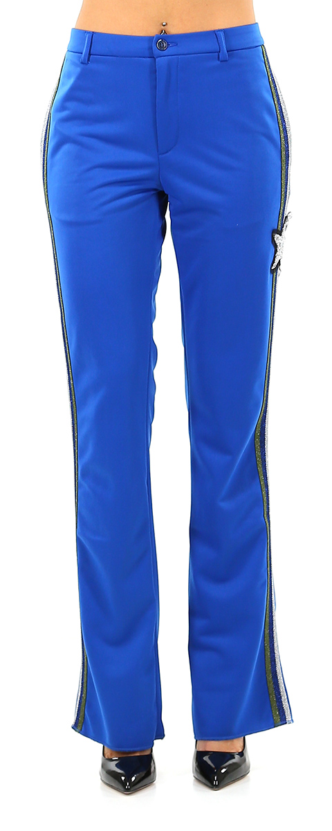 Pantalone a zampa in jersey, tasche laterali e a filetto sul retro. Bande colorate e stampa in glitter. La modella è alta 1.68 ed indossa la taglia XS.