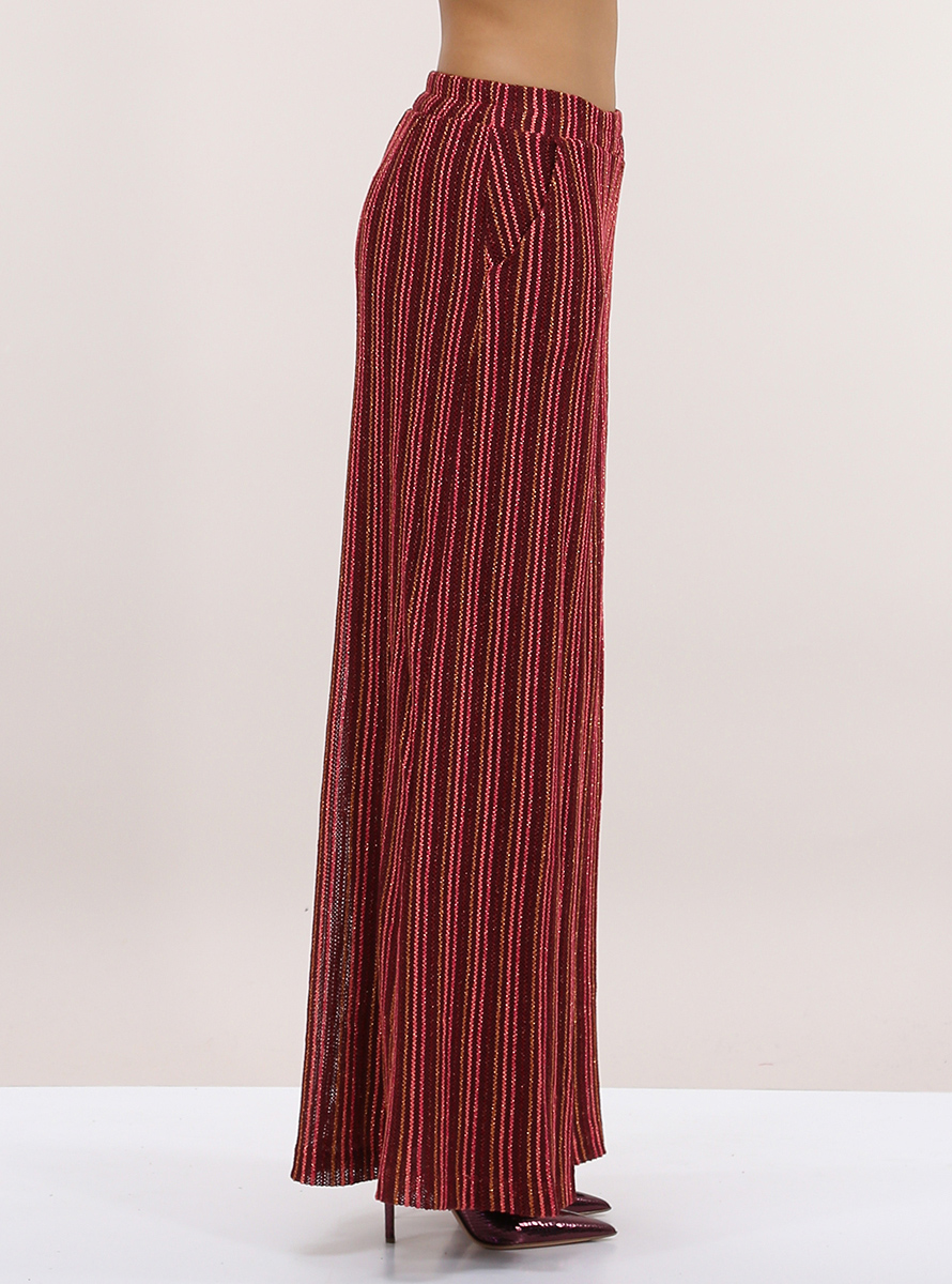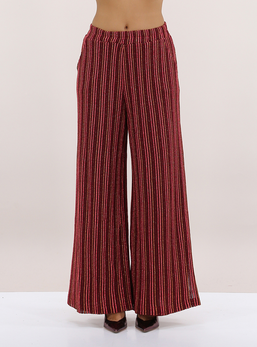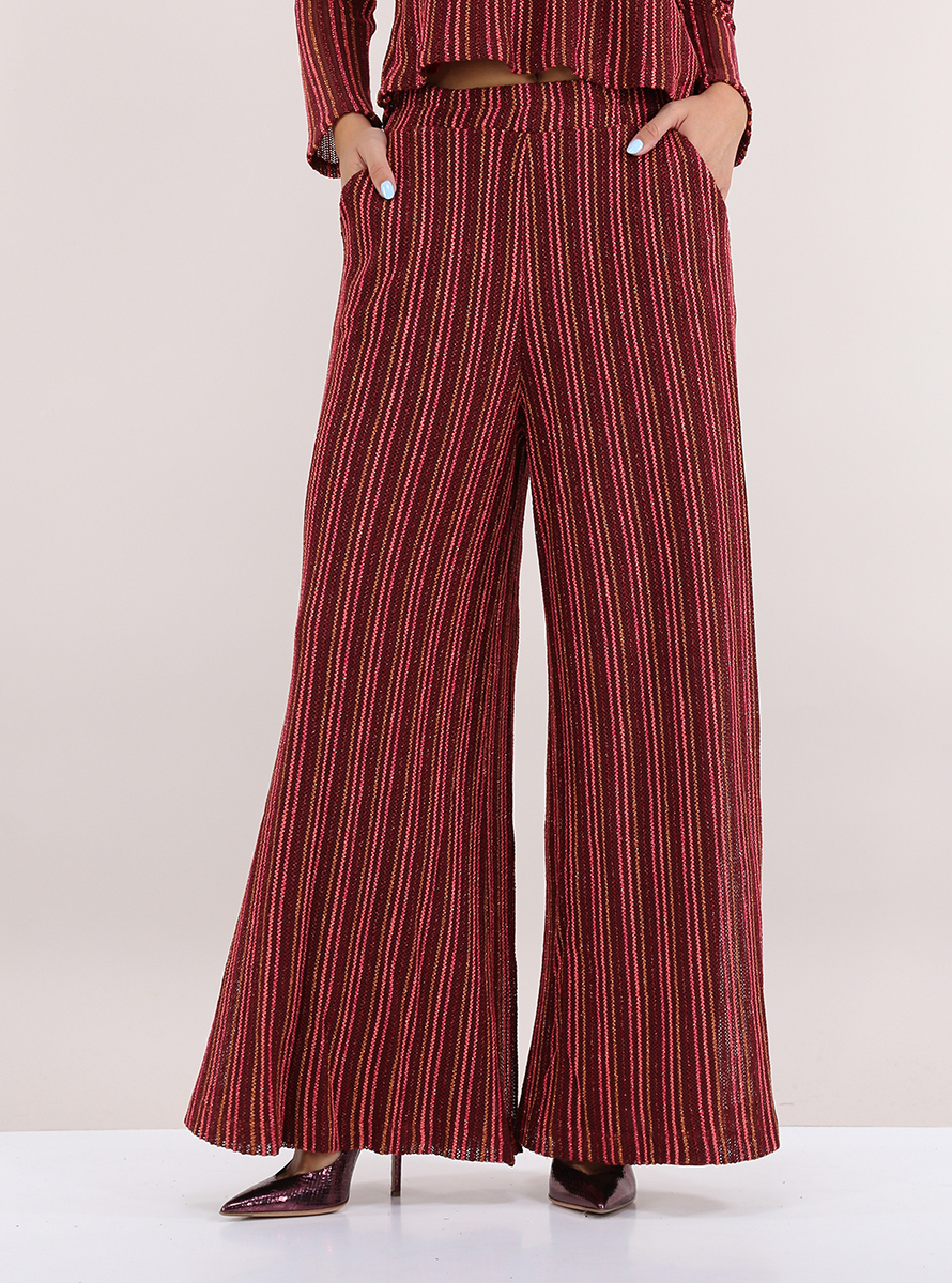 Pantalone fonderato a palazzo Pho Firenze in misto cotone e viscosa. Vita alta con elastico e tasche all'americana. Fantasia a righe multicolor con lurex. La modella è alta 1.70 ed indossa la taglia XS.