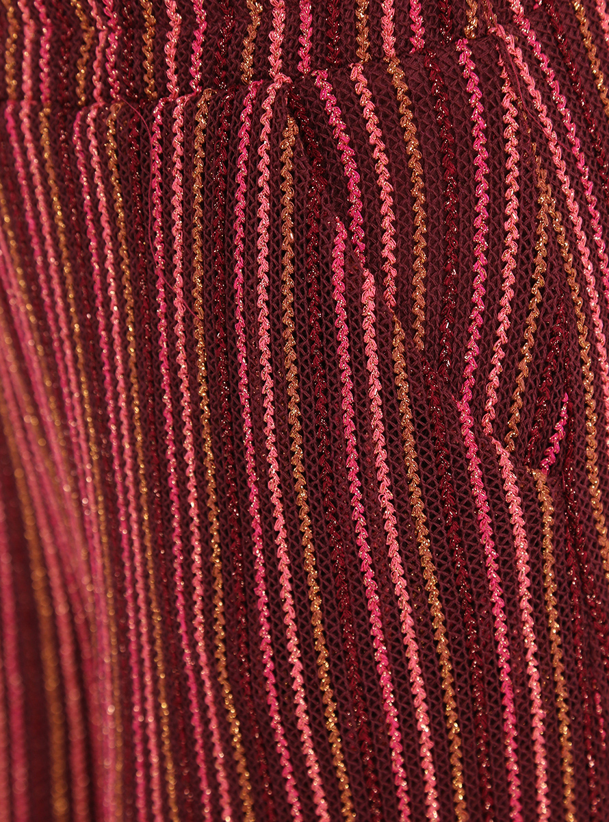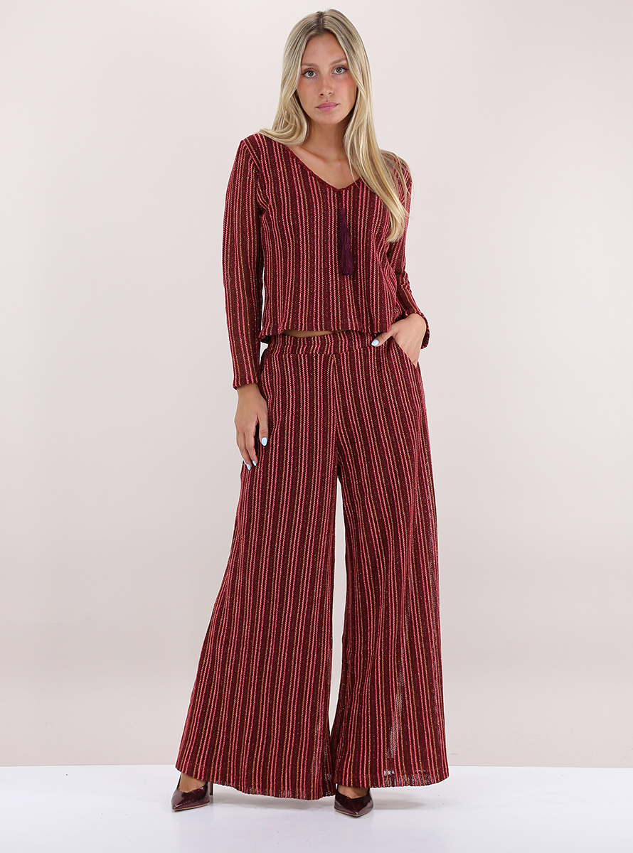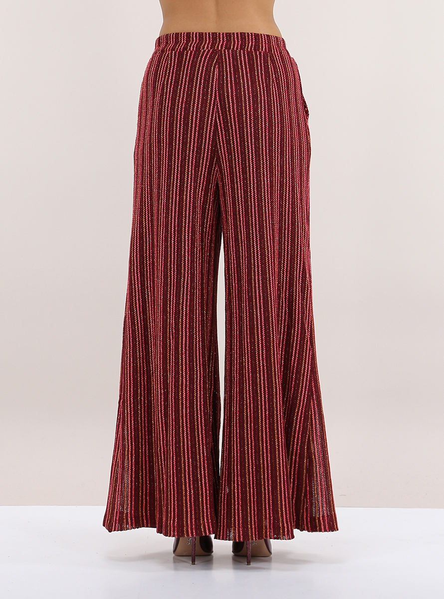 Pantalone fonderato a palazzo Pho Firenze in misto cotone e viscosa. Vita alta con elastico e tasche all'americana. Fantasia a righe multicolor con lurex. La modella è alta 1.70 ed indossa la taglia XS.