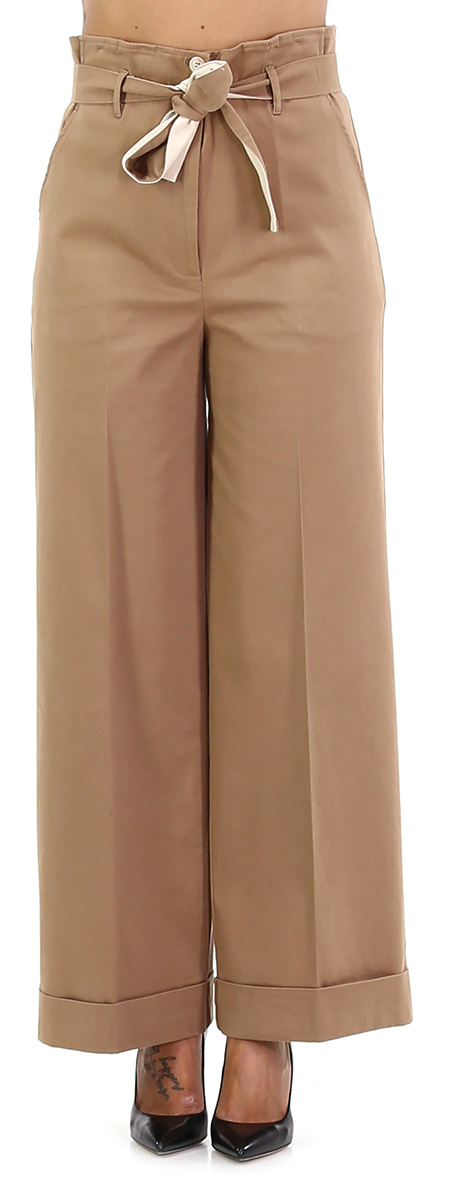 Pantalone palazzo in cotone ed elastane con risvolto sul fondo, tasche all'americana laterali ed a toppa sul retro. Cintura a contrasto inclusa. La modella è alta 1.80 ed indossa la taglia 44.