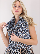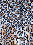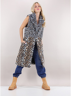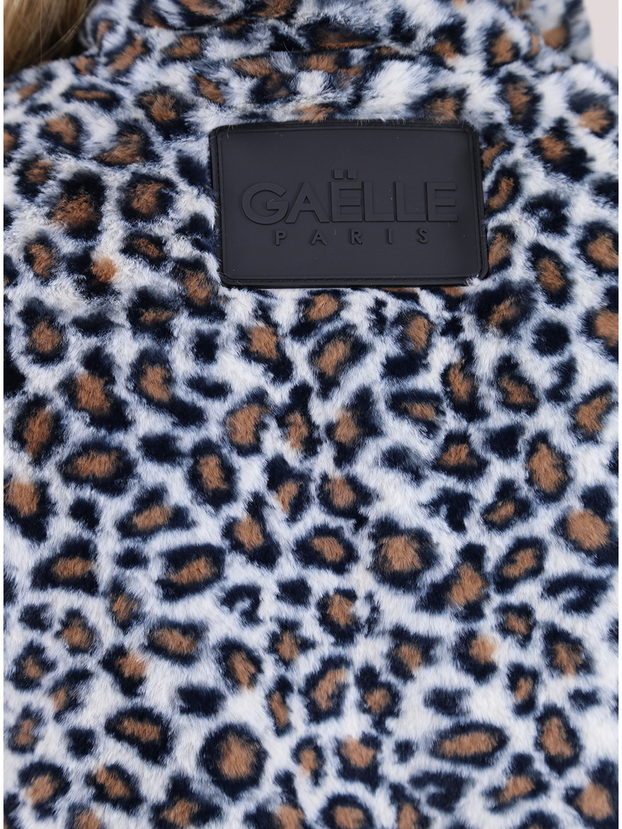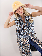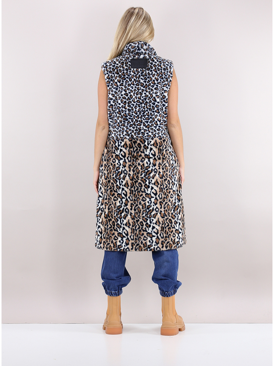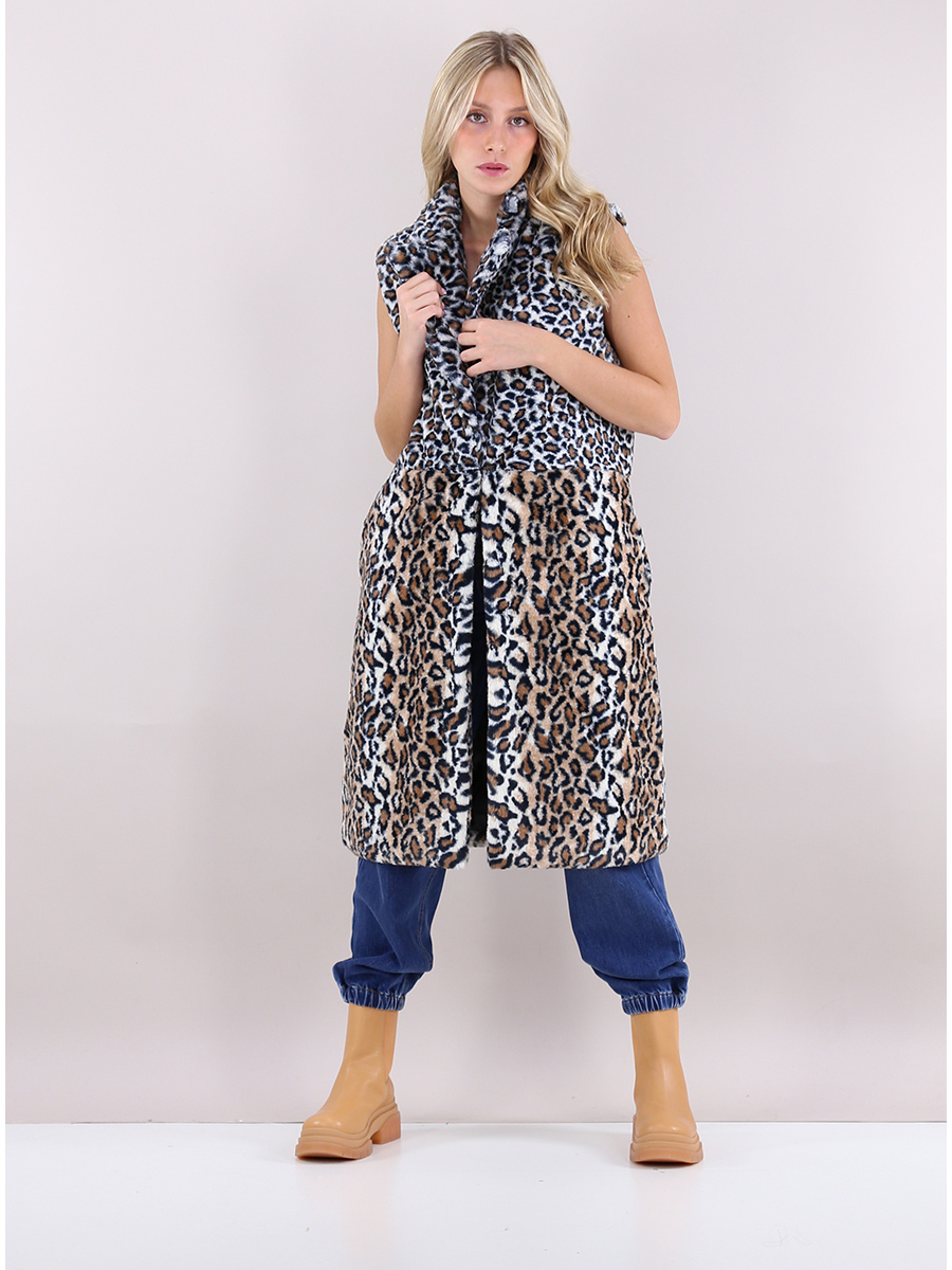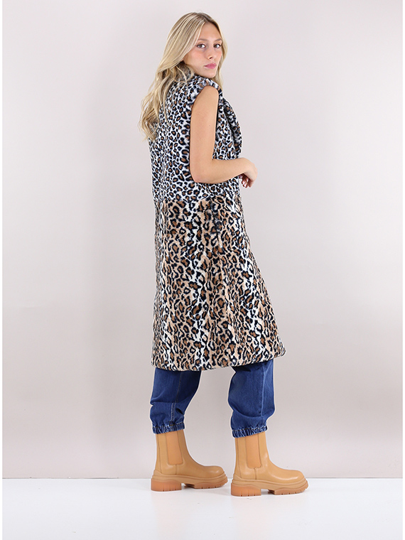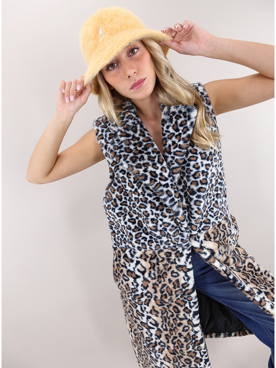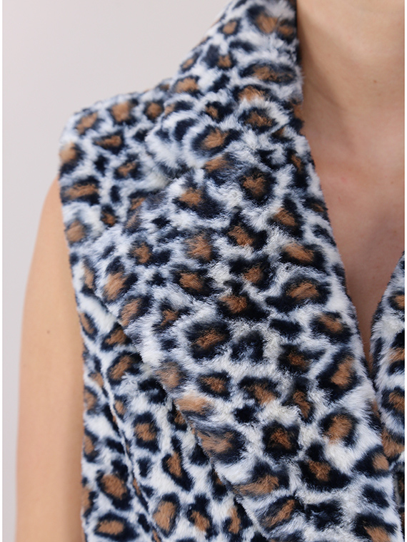 Gilet foderato in fake fur Gaelle Paris. Scollo a reverse e tasche a sacchetto. Fantasia animalier sfumata. La modella è alta 1,70 cm ed indossa la taglia 42.