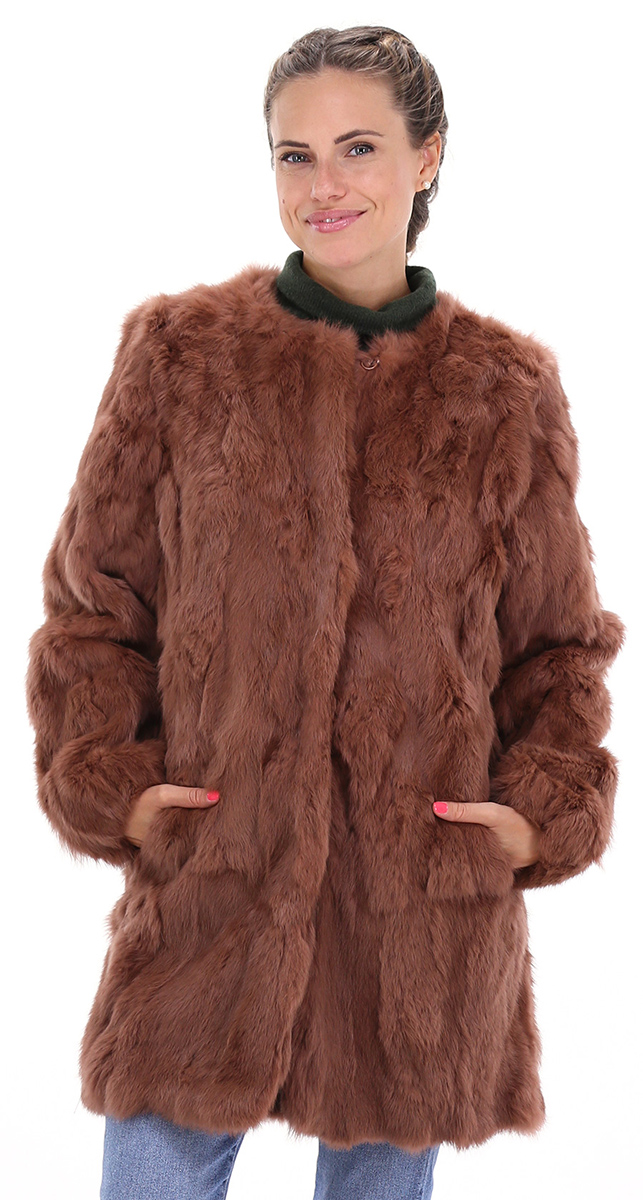 Pelliccia in lapin foderata a maniche lunghe e collo a giro. Tasche a sacchetto laterali e ganci di chiusura. La modella è alta 1.68 ed indossa la taglia S.