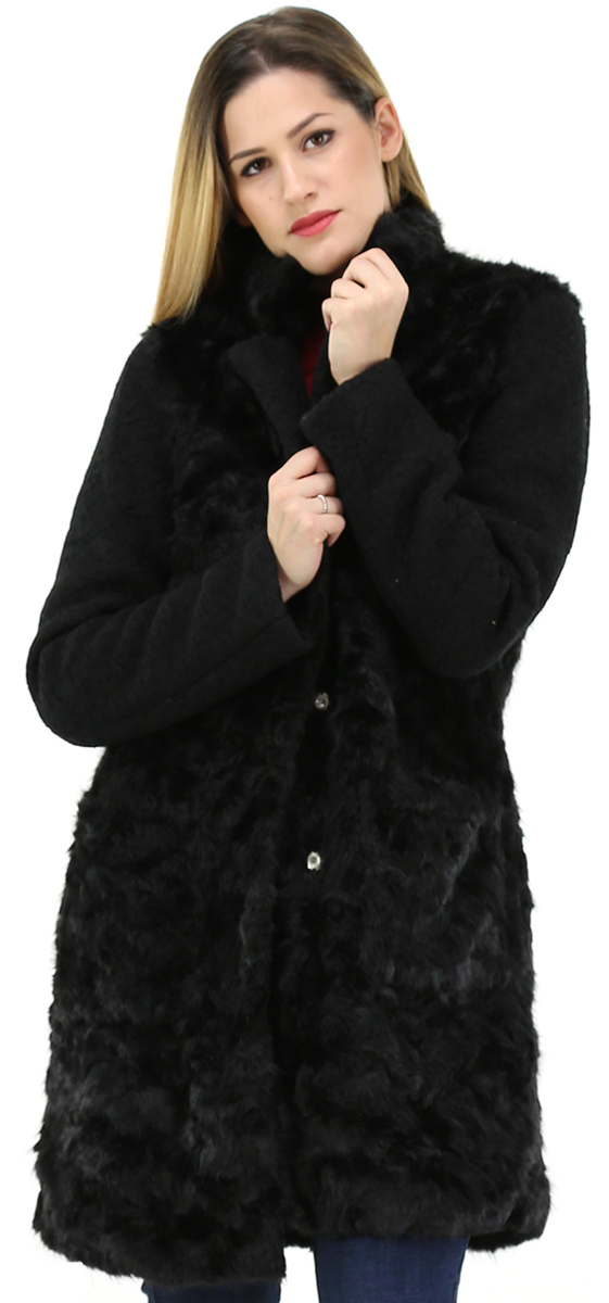 Cappotto foderato in fake fur a maniche lunghe in tessuto, collo reverse, tasche applicate e automatici di chiusura frontali. La modella è alta 1.75 ed indossa la taglia M.