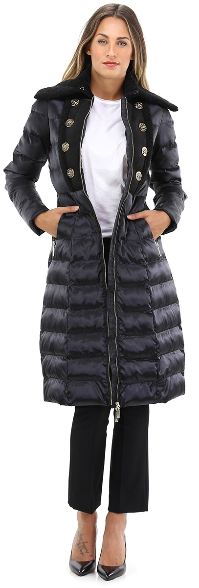 Piumino imbottito sfiancato a manica lunga. Collo classico in fake fur. Bavero con bottoni gold, tasche oblique e zip di chiusura frontale. La modella è alta 1,80 ed indossa la taglia 40.