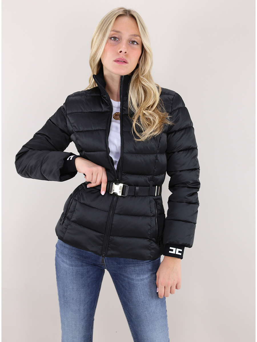 Piumino sfiancato Elisabetta Franchi. Maniche lunghe con polsino logato e collo a fascia. Chiusura e tasche con zip frontali. Cintura con fibbia logata gold. La modella è alta 1,70 cm ed indossa la taglia 40. Questo capo è stato prodotto abolendo totalmente l'imbottitura naturale, in favore di materiali ecosostenibili di prima qualità. Una scelta etica, "cruelty free", che garantisce un capo leggero ed una perfetta protezione dal freddo.