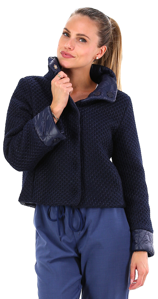 Piumino corto reversibile, con una parte in misto Lana ad effetto nido d'ape e l'altra trapuntata, maniche lunghe, tasche a sacchetto e collo a fascia. Automatici di chiusura frontali. La modella è alta 1,68 ed indossa la taglia 42.