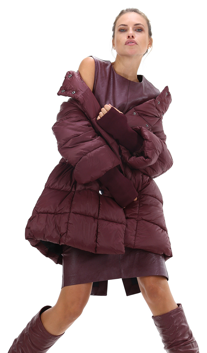 Piumino svasato a maniche lunghe con polsino. Collo a fascia con cappuccio estraibile. Tasche a sacchetto laterali e automatici di chiusura a doppio petto frontali. La modella è alta 1,68 cm ed indossa la taglia 40.