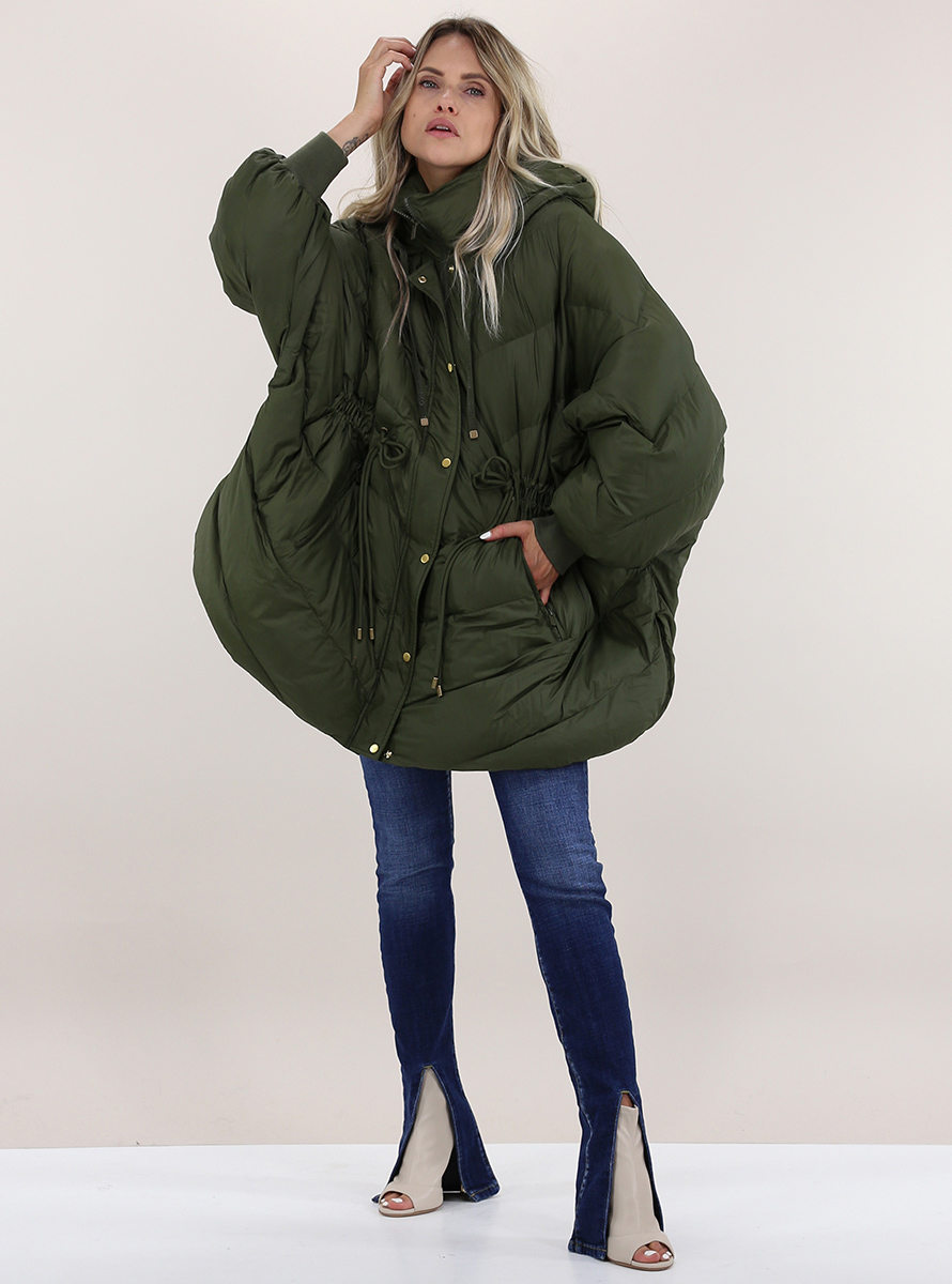 Piumino over Pinko in tela tecnica. Maniche lunghe a kimono e collo a cappuccio con coulisse. Elastici in vita con coulisse. Tasche a sacchetto e automatici di chiusura gold. Fondo asimmetrico. La modella è alta 1.68 ed indossa la taglia S.