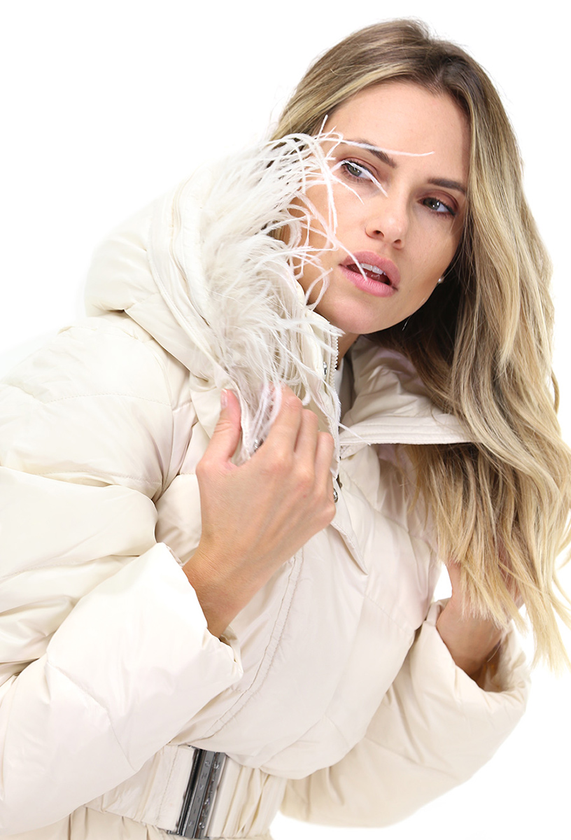 Piumino a maniche lunghe e collo a fascia. Cappuccio estraibile con decorazione in piuma applicabile con zip. Tasche a sacchetto frontali con zip e automatici di chiusura. La modella è alta 1,68 cm ed indossa la taglia 40.