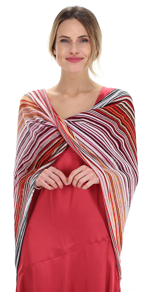Poncho asimmetrico incrociato frontale. Scollo a V profondo sul retro e fondo asimmetrico con frange applicate. La modella è alta 1.68 ed indossa taglia unica.