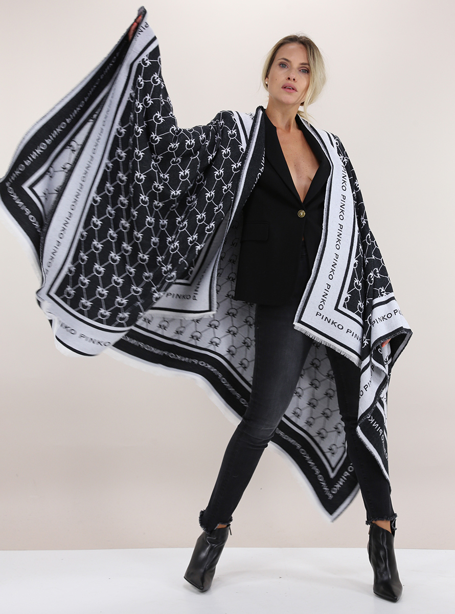 Poncho Pinko in misto lana con bordi logati e fondo sfrangiato. La modella è alta1,68 e indossa la taglia UNICA.
