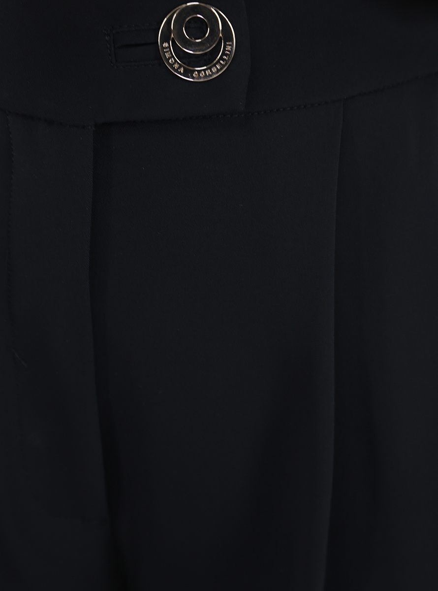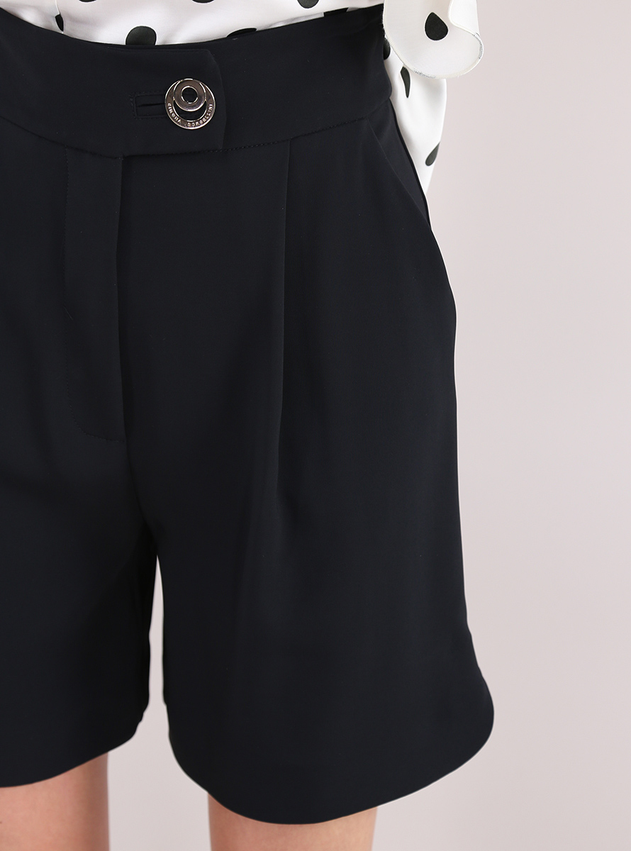 Shorts Simona Corsellini in misto viscosa. Pinces frontali, tasche all'americana e bottone di chiusura frontale logato. La modella è alta 1,74 cm ed indossa la taglia 40.