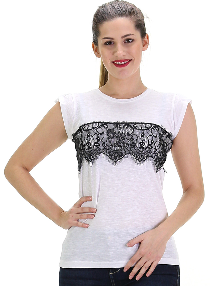 T-Shirt in cotone con pizzo frontale, collo a giro e maniche ad aletta. La modella è alta 1,68 ed indossa la taglia S.
