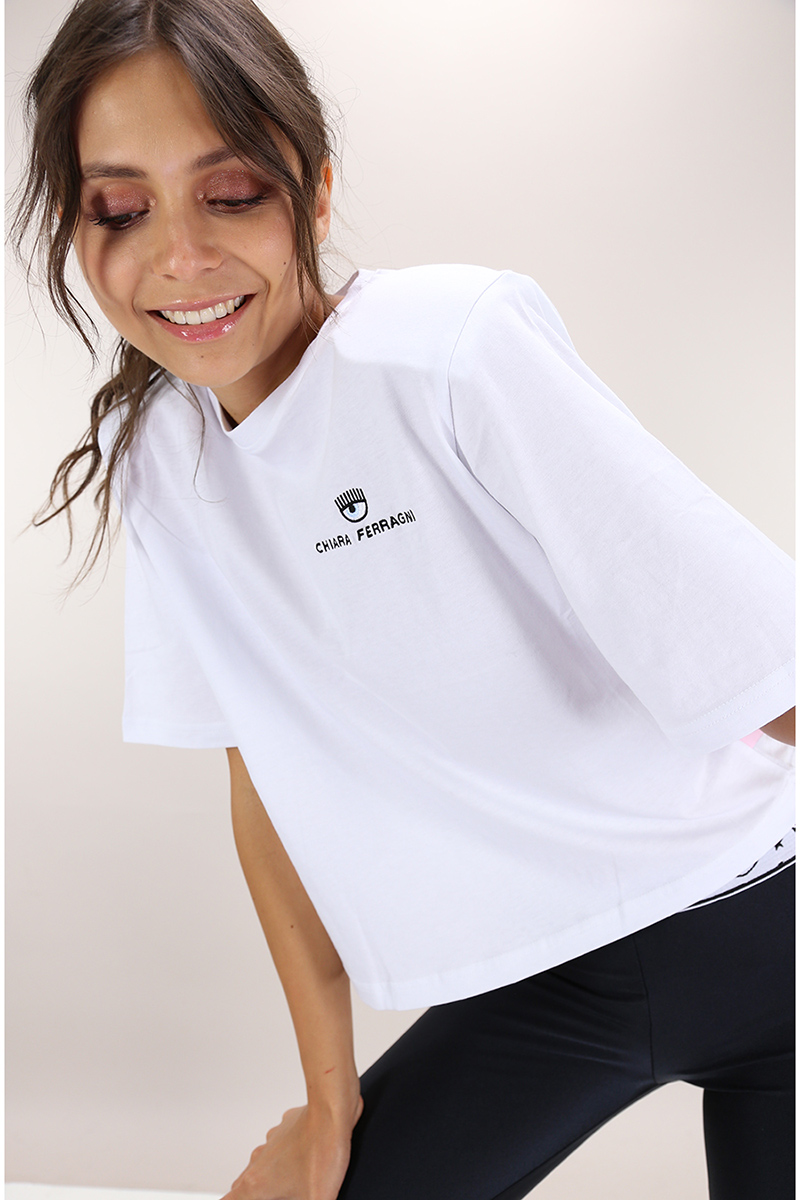 T-shirt Chiara Ferragni oversize in cotone a maniche corte con spalle imbottite e collo a giro. Logo ricamato frontale. La modella è alta 1.80 ed indossa la taglia XS.