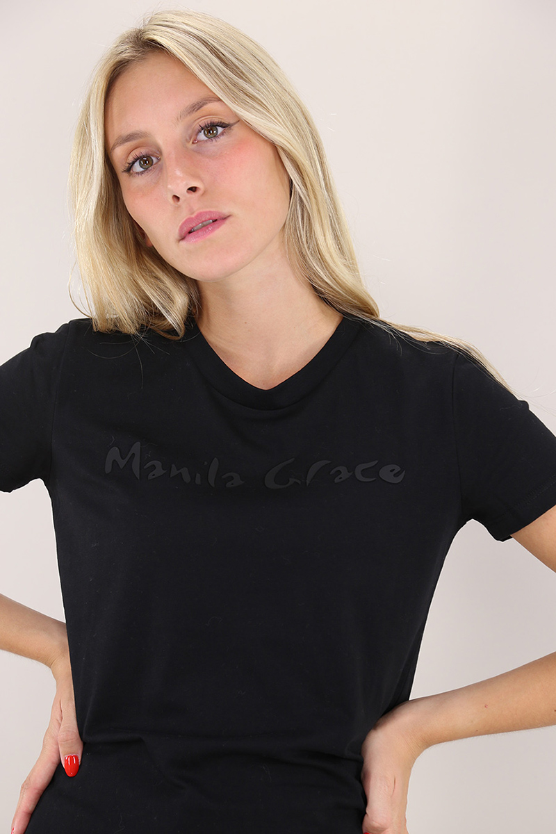 T-shirt manila Grace in cotone a maniche corte e collo a giro. Applicazione logata frontale tono su tono. La modella è alta 1.70 ed indossa una taglia XS.