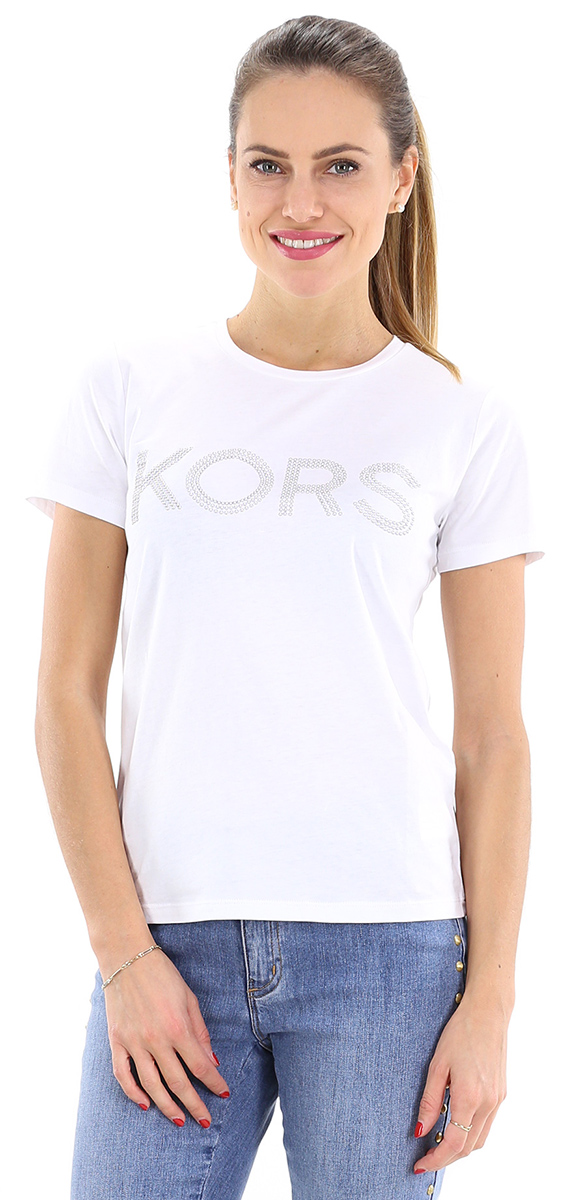T-shirt in cotone a maniche corte e collo a giro. Stampa logata con borchie applicate frontale.