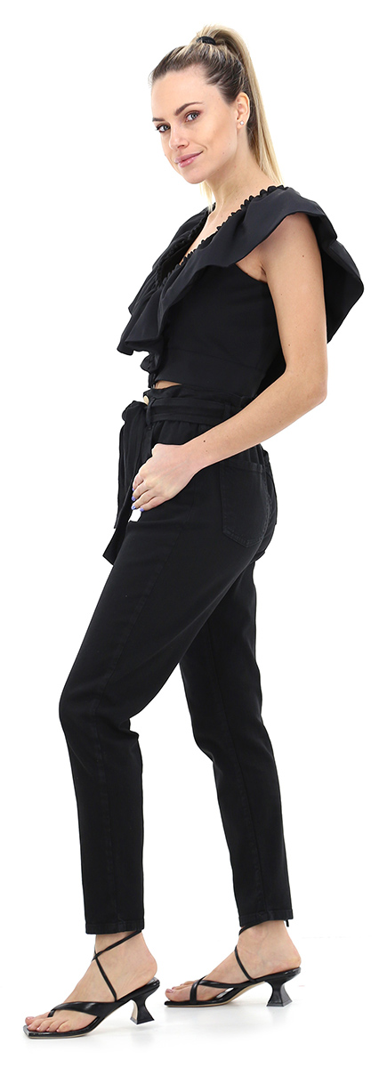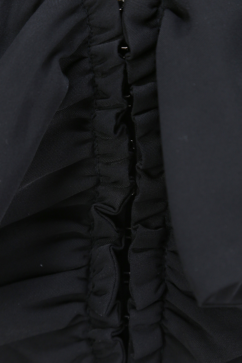 Top cropped foderato con voulant applicato fronte e retro. Scollo a V con ganci di chiusura frontali. La modella è alta 1.68 ed indossa la taglia XS.