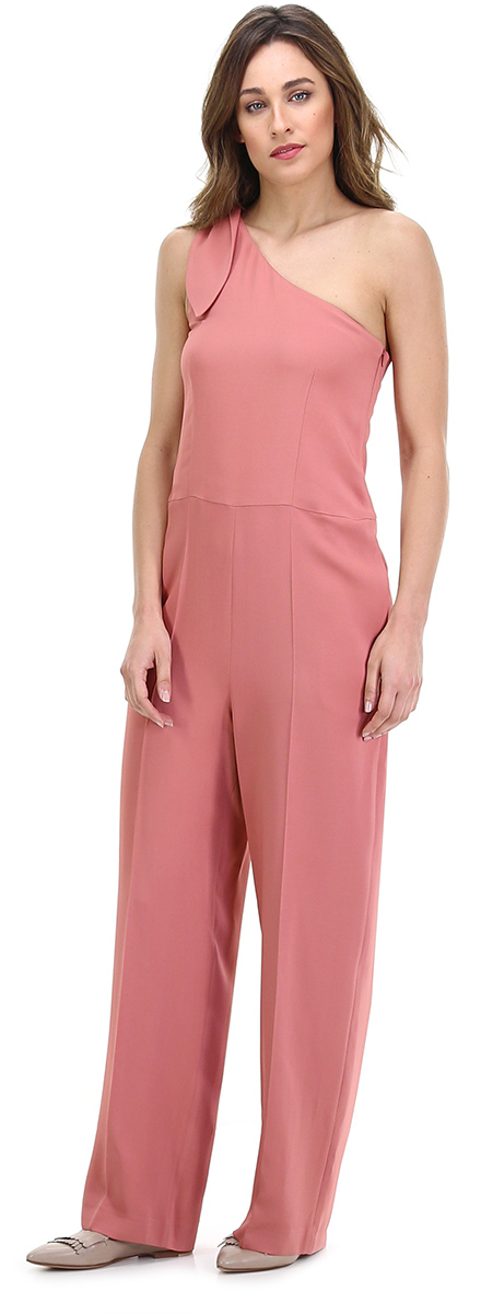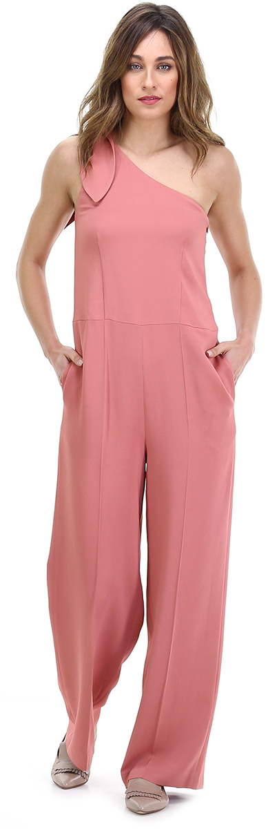 Tuta palazzo a monospalla in viscosa stretch con tasche a sacchetto laterali. Fiocco applicato su spalla e zip di chiusura laterale. La modella è alta 1.80 ed indossa la taglia 44.