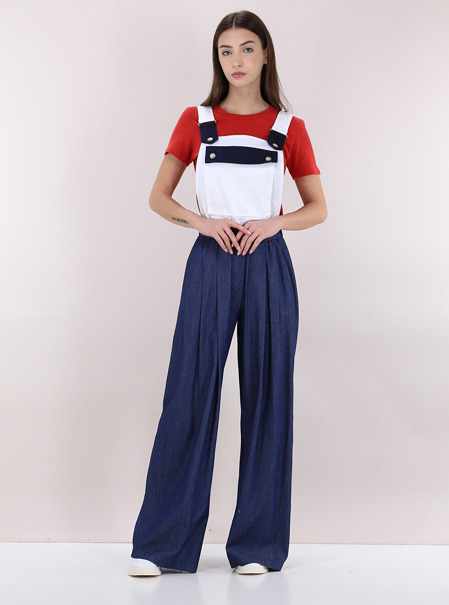 Salopette a palazzo Cactus in cotone con elastico in vita e tasche all'americana. Corpetto staccabile frontale a contrasto. Bretelle con bottoni di chiusura. La modella è alta 1.70 e indossa la taglia S