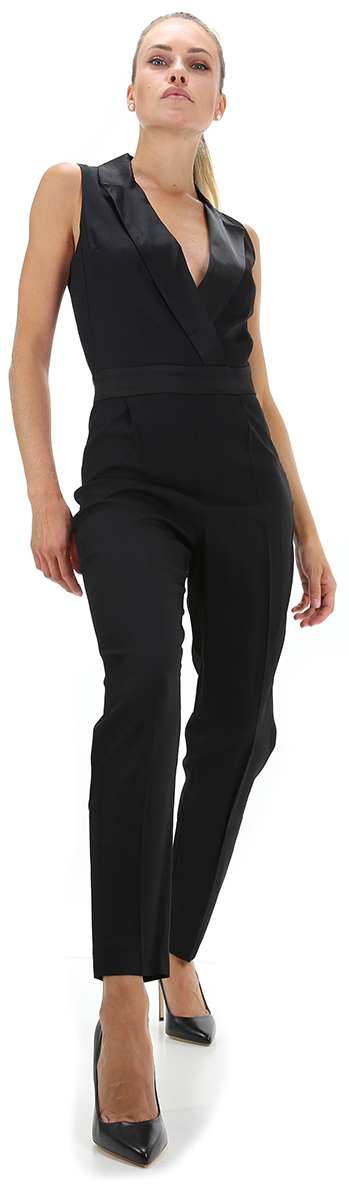 Tuta morbida in misto viscosa con scollo a reverse incrociato a contrasto. Zip di chiusura laterale. La modella è alta 1.68 ed indossa la taglia 38.