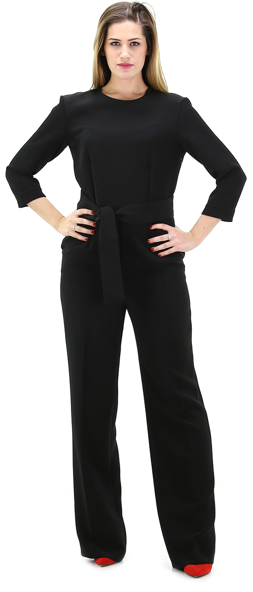 Tuta palazzo con tasche all'americana sui fianchi e zip sul lato. Maniche a tre quarti, collo a giro con bottone di chiusura a goccia sul retro. Cintura in tessuto inclusa. La modella è alta 1,75 ed indossa la taglia 44.