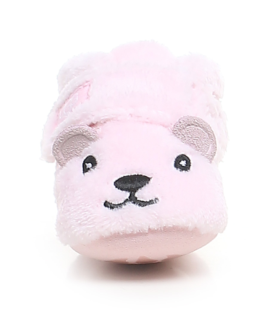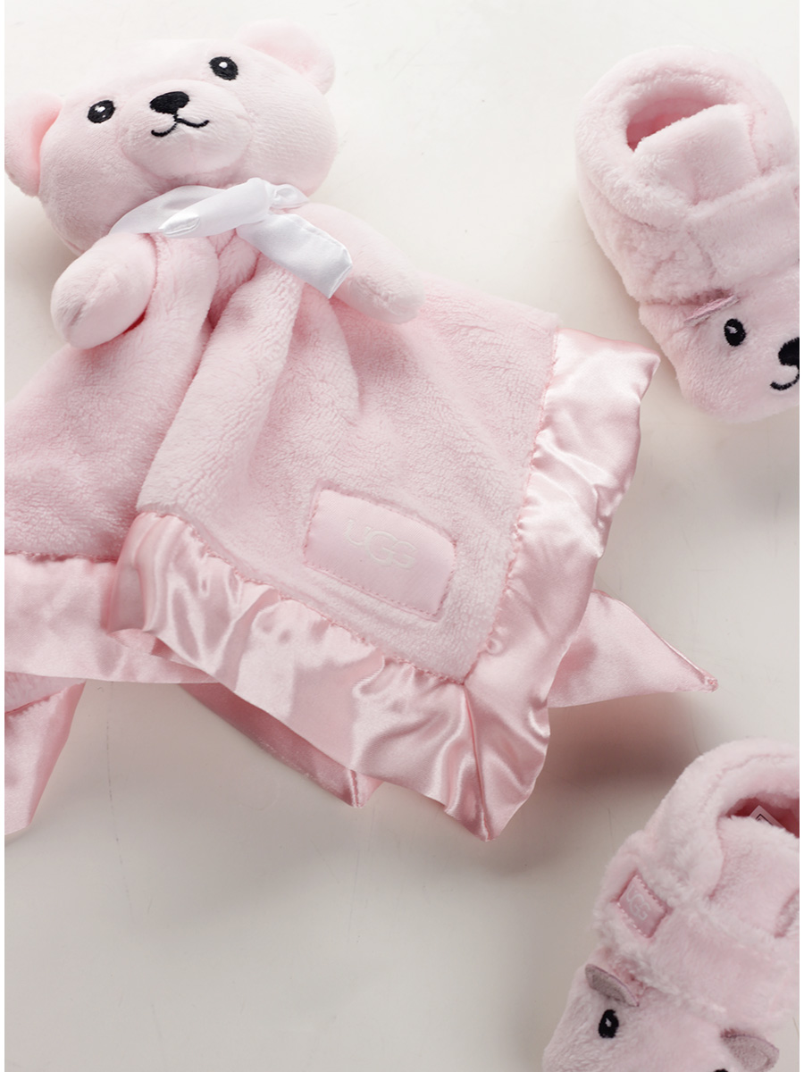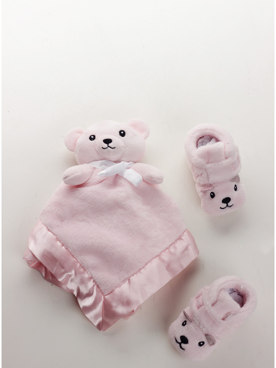 Scarpa in pile con suola in microfibra con stampa in gomma antiscivolo. Mini coperta in pile con finiture in raso compresa. Dimensione coperta 35,6 x 35,6.