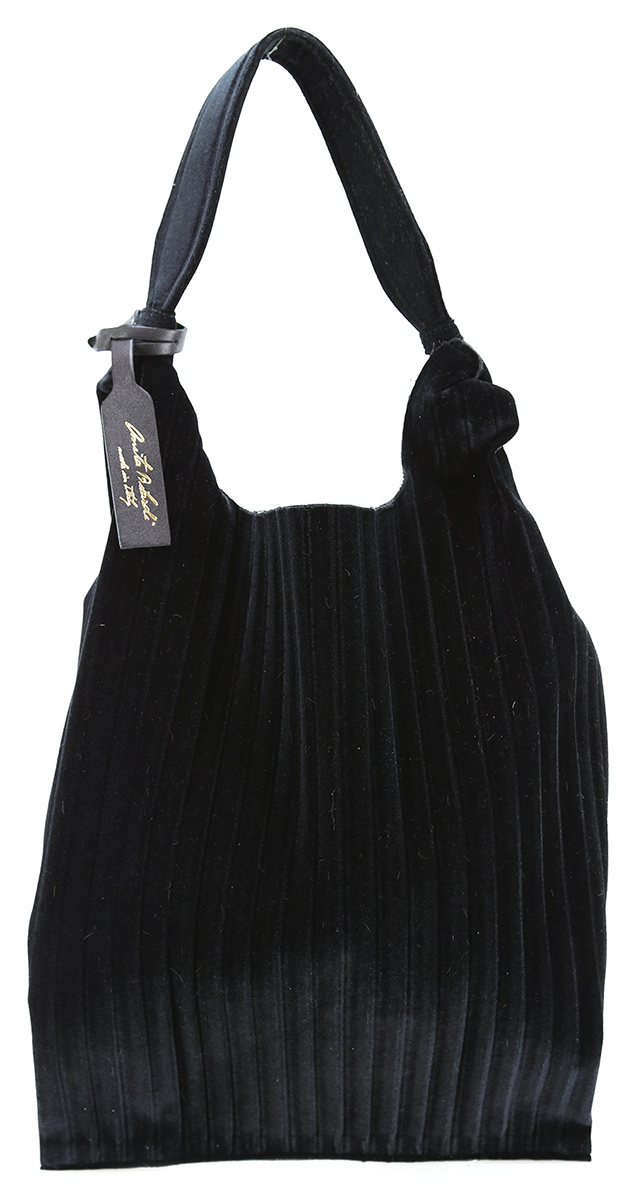 Borsa in velluto plissettato e targhetta con logo. Manico e interno in pelle. Misure 28 x 47 cm. Dettagli gold.