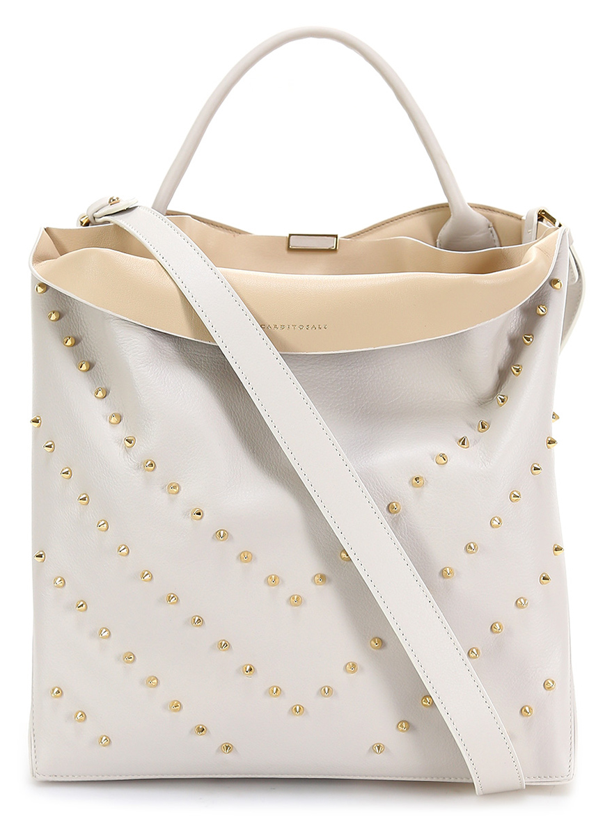 Borsa in pelle effetto martellato con chiusura ad incastro e borchie frontali. Tracolla e pochette interna inclusa. Misure 30 x 30 cm. Dettagli gold.