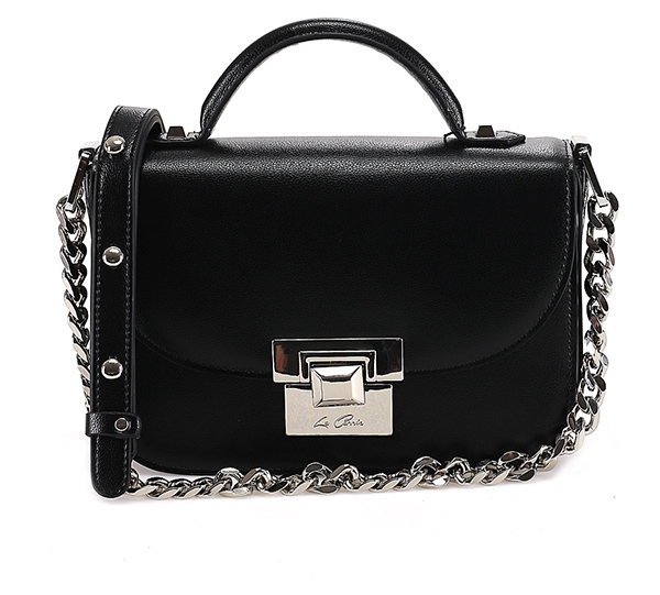 Borsa in eco pelle, pattella con chiusura a gancio e tracolla regolabile a catena. Interno a doppio compartimento. Misure 22x15 cm.