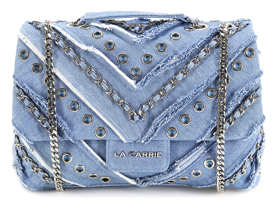 Borsa in tessuto con bottone magnetico di chiusura. Tracolla inclusa. Misure 32 x 22 cm. Dettagli silver.