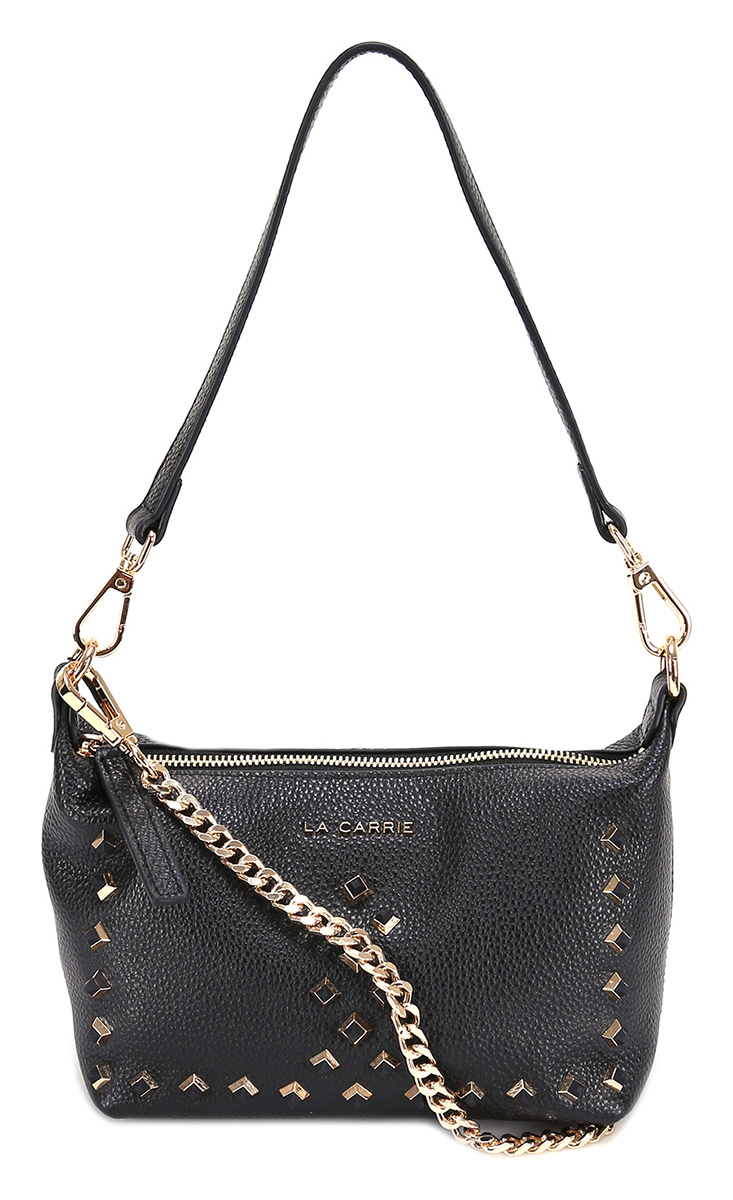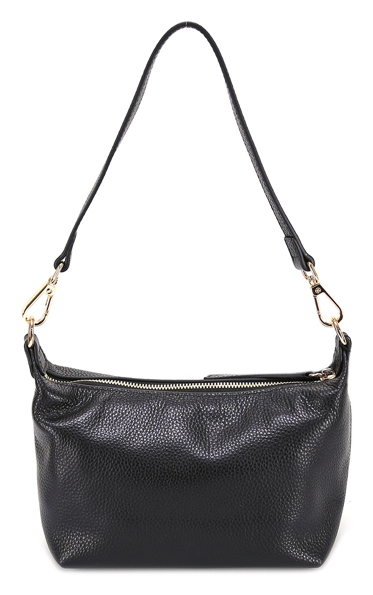 Borsa in pelle con zip di chiusura. Tracolla inclusa. Borche applicate. Misure 26 x 15 cm.